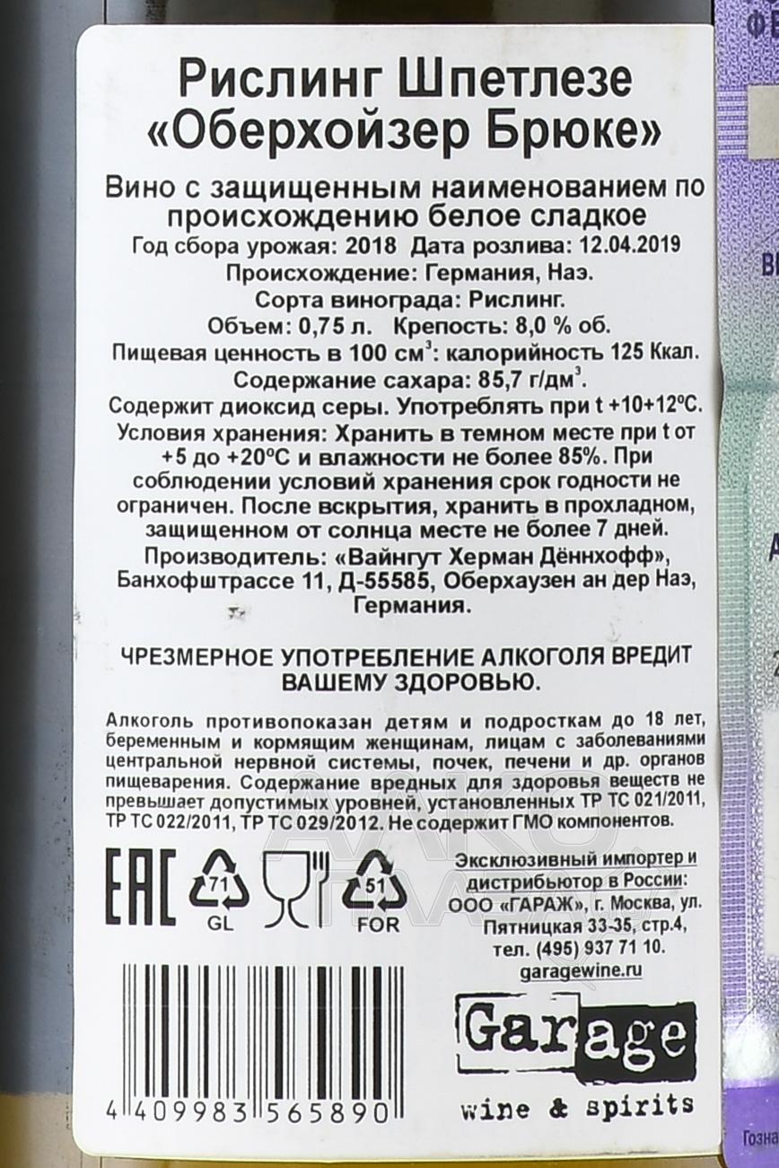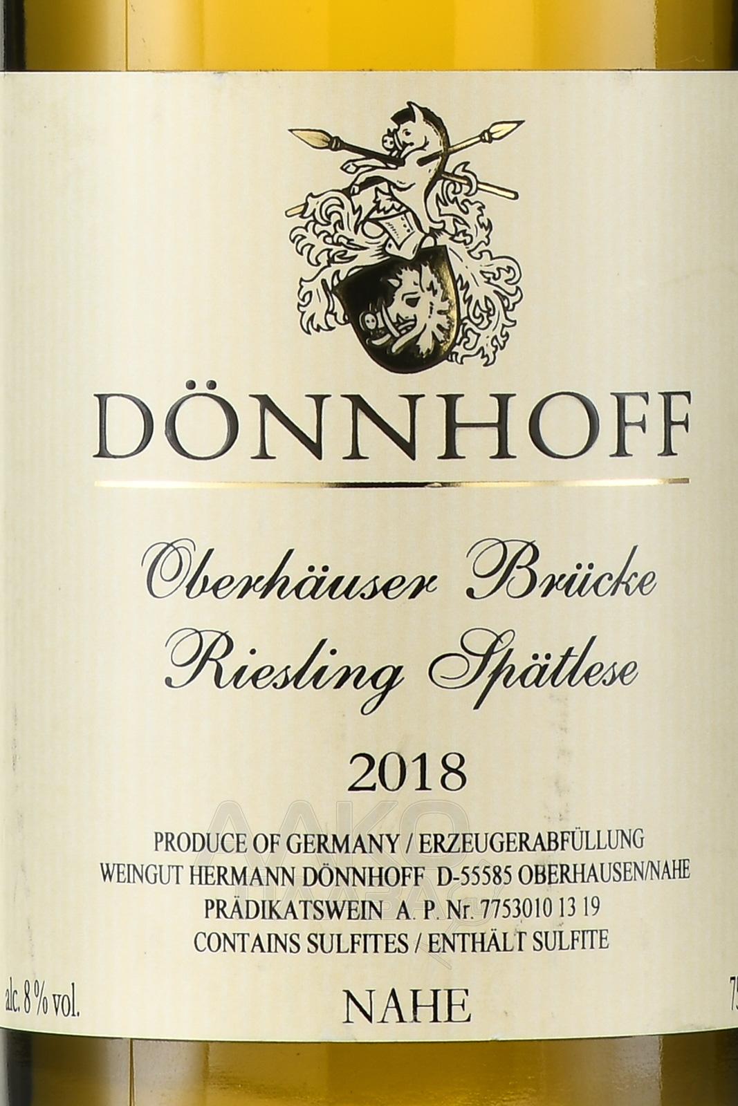 Donnhoff Riesling Spatlese Oberhauser Brucke 0.75l - белое сладкое вино родом из Германии, ягоды для которого были собраны со старых лоз (25-45 лет) в долине реки Наэ на почвах с примесью песка, известкового сланца и суглинка.