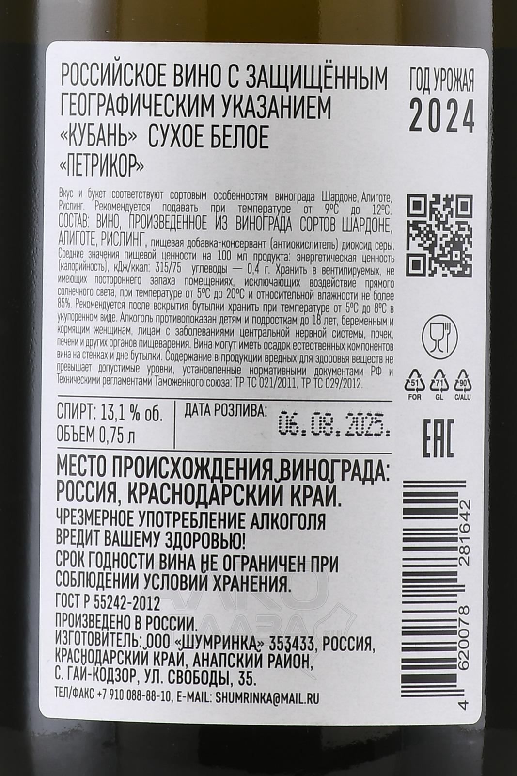 Белое сухое вино Петрикор 0,75 л — пример напитка, название которого отражает характер. Бренд получил имя от термина, который обозначает свежий аромат земли после дождя. Виноград для производства собирают на южных склонах с известняково-глинистыми почвами, где солнечный день сменяется прохладной ночью. Такой перепад температур помогает ягодам накапливать сахар, сохраняя кислотность. Урожайность на участках ограничена, сбор производится вручную и только целые грозди идут на переработку. Винификация проходит в нержавеющих емкостях при невысокой температуре, чтобы сохранить чистоту вкуса.