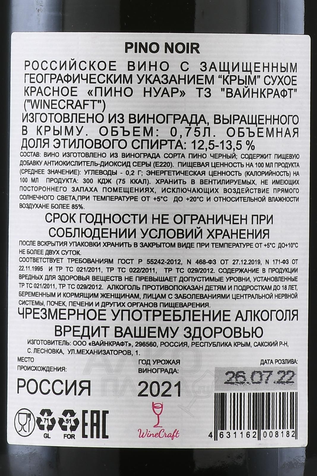 Вино красное сухое Пино Нуар Winecraft 2022 г. 0,75 л изготовлено из урожаев одного сбора, созревших в благоприятном для лоз крымском терруаре. Напиток происходит с участков, которые территориально расположенных в рамках защищенного географического указания «Крым», недалеко от Бахчисарая. Почвы здесь похожи на бордоские – это один из факторов, позволяющих получать спиртное, сравнимое по качеству с французскими образцами. Винификация проходила традиционно на мезге, температура брожения строго контролировалась. После окончания ферментации сброженное сусло очистили от кожицы и косточек и оставили отдыхать несколько месяцев в стальных резервуарах.