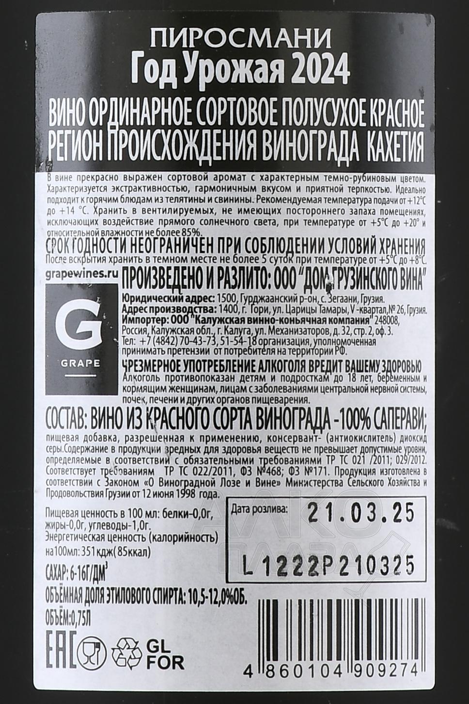 Красное полусухое вино Пиросмани Кахетинские Подвалы 0,75 л — это яркий представитель грузинского виноделия с отчетливой сортовой стилистикой и аутентичными чертами. Для производства был использован виноград Саперави, выращенный в Кахетии. Регион отличается благоприятным климатом и уникальными почвами, способствующими накоплению в ягодах разнообразных ароматических соединений. Качество винограда было высоким. Вино создавалось по традиционной технологии с контролем температуры брожения, что позволило сохранить выразительность и оттенки типичные оттенки грузинского автохтона. Выдержка протекала в стальных чанах, что позволило подчеркнуть свежесть и фруктовость напитка.