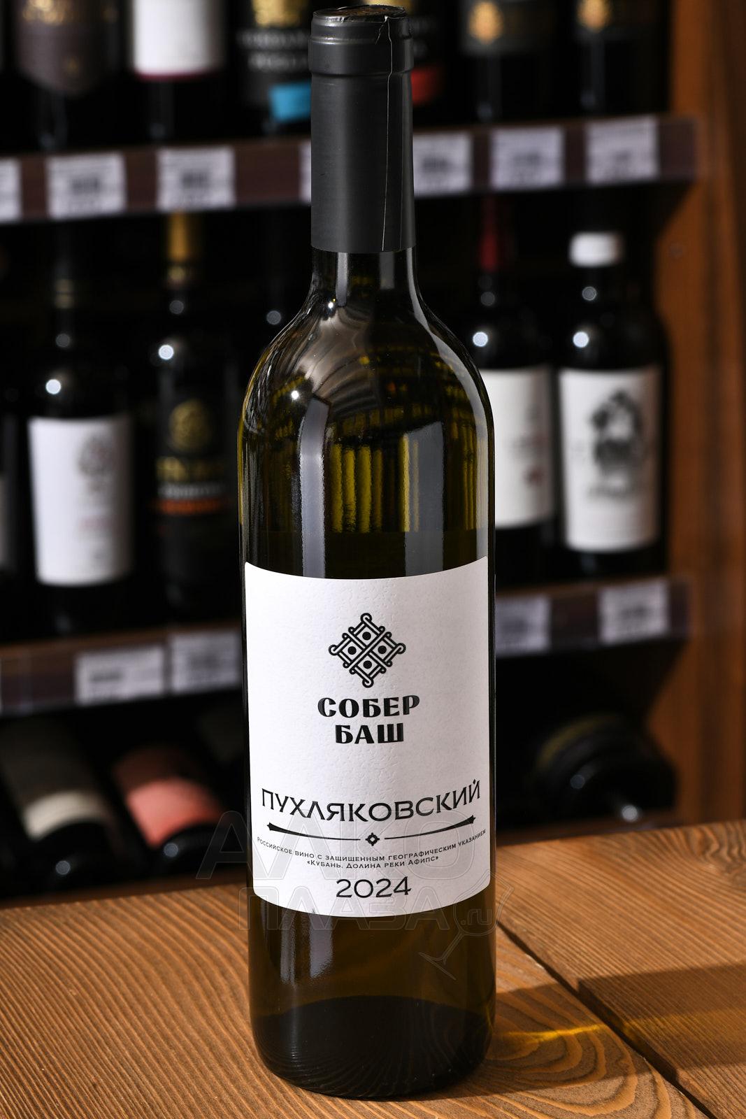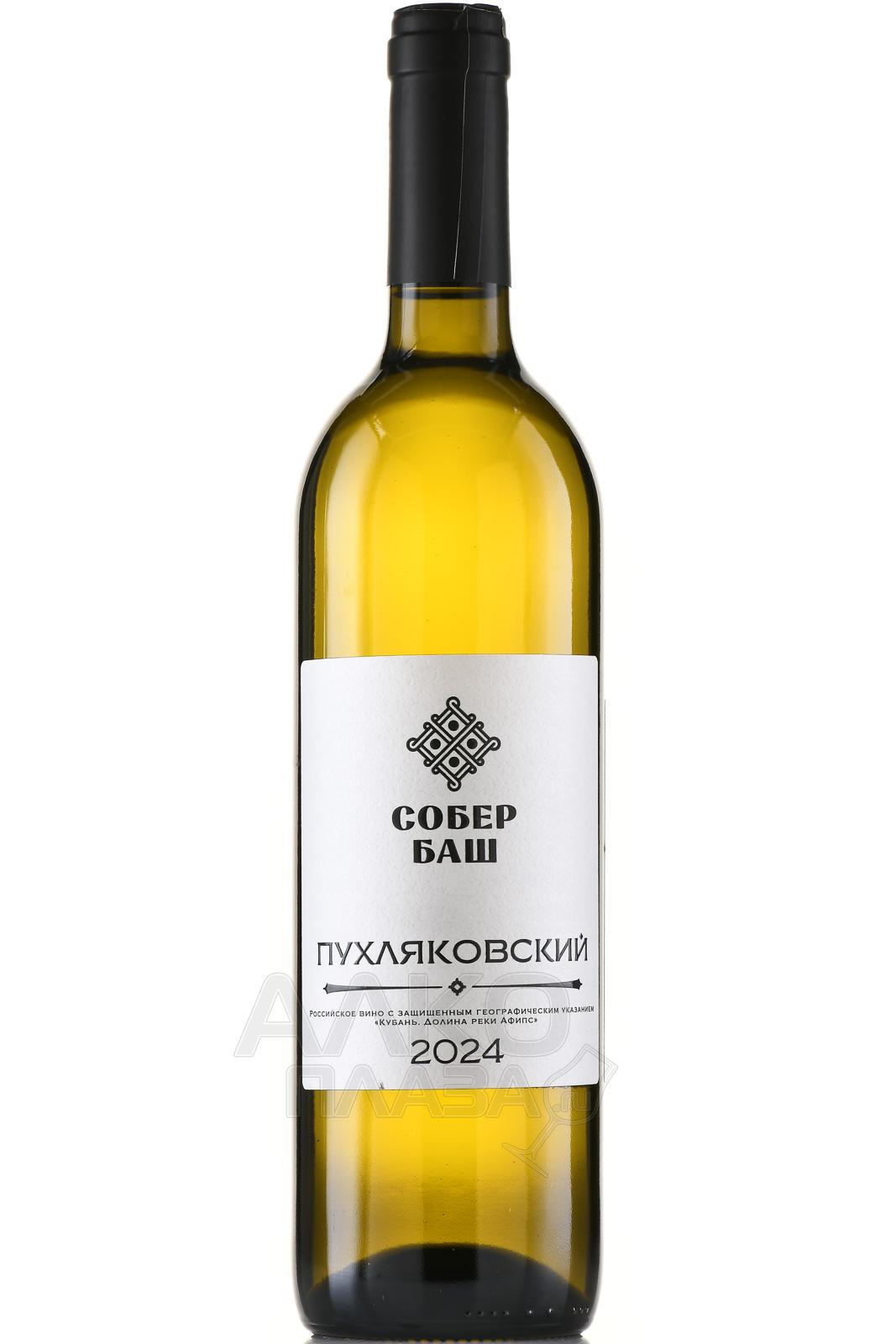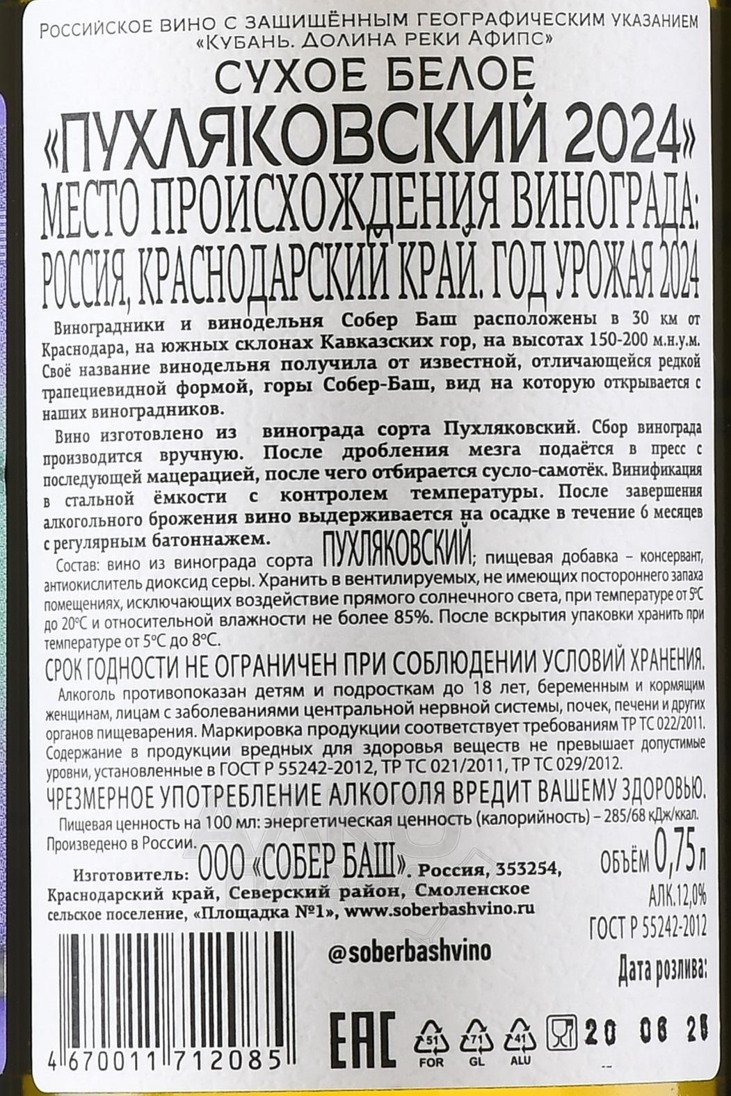 Белое сухое вино Пухляковский Собер Баш 2022 г. 0,75 л произведено в России, Краснодарском крае, из отборного виноградного сырья: спелых ягод сорта позднего периода созревания, собранных в один год урожая на плантациях склонов Кавказских гор. Сырье аккуратного ручного сбора, отсортированное для удаления поврежденного винограда, подверглось низкотемпературной контролируемой ферментации в металлических нейтральных емкостях. По окончании этого процесса вино было подвергнуто шестимесячной выдержке на осадке с проведением регулярного батонажа.