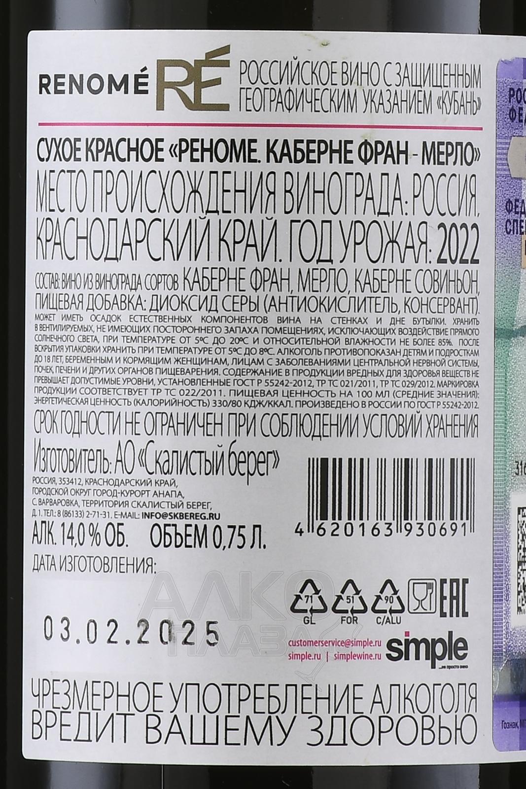 Красное сухое вино Реноме Каберне Фран Мерло 0,75 л — гармоничный купаж, созданный по образцу классических традиций Бордо, но с выражением местного терруара. Виноградники расположены на южных склонах, где известняково-глинистые почвы с песчаником формируют плотный и структурный характер ягод. В регионе с мягким климатом тёплое лето, достаточное количество солнечных дней и прохладные ночи помогают сохранить кислотность и ароматичность. Урожай собирают вручную, с сортировкой гроздей. Брожение проходит в стальных резервуарах при контролируемой температуре. После этого напиток частично выдерживается в дубовых бочках для приобретения глубины и мягкости.