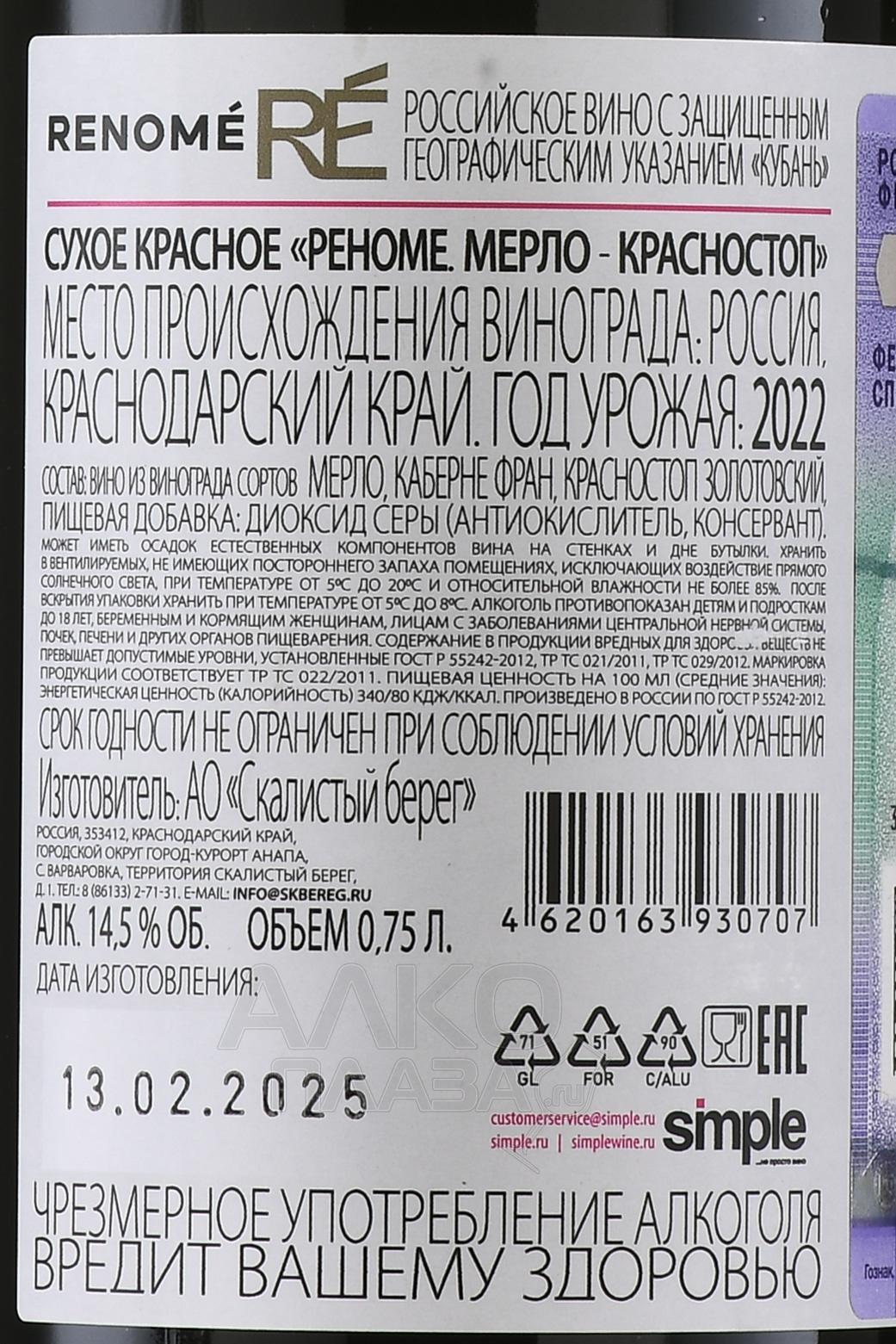 Красное сухое вино Реноме Мерло Красностоп 0,75 л — это союз классического европейского сорта и исконного донского винограда. Виноградники расположены на Кубани, где тёплый климат Черноморского побережья создаёт оптимальные условия для вызревания ягод. Почвы региона— разнородные: глинисто-известняковые и песчаные участки формируют разные акценты в характере напитка, придавая ему выразительность. Лето здесь жаркое и солнечное, осень — продолжительная и сухая, что позволяет получить полноценный урожай без риска потери свежести. Сбор проводят вручную, внимательно отбирая грозди. Ферментация проходит при контролируемой температуре, а после следует выдержка до розлива.