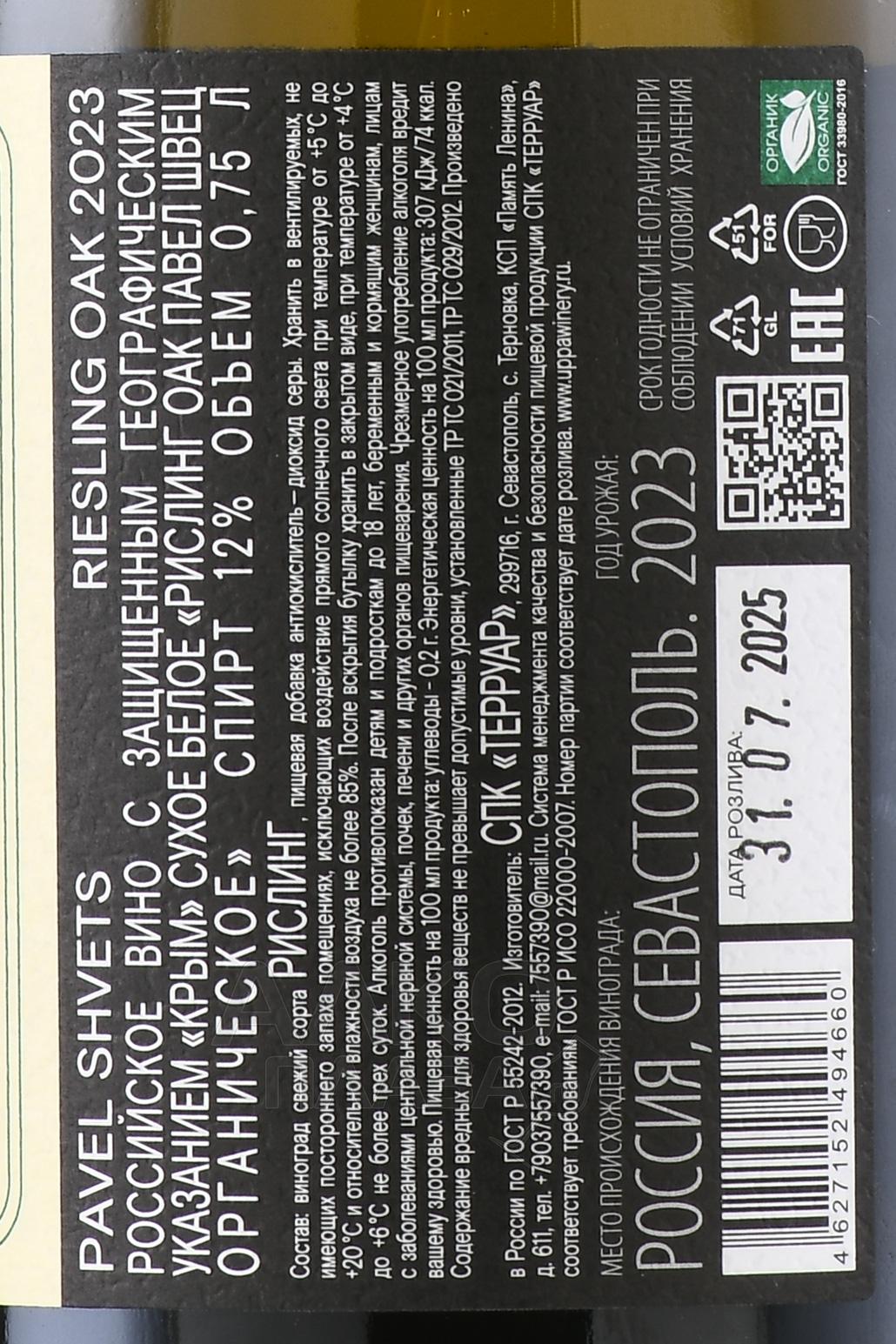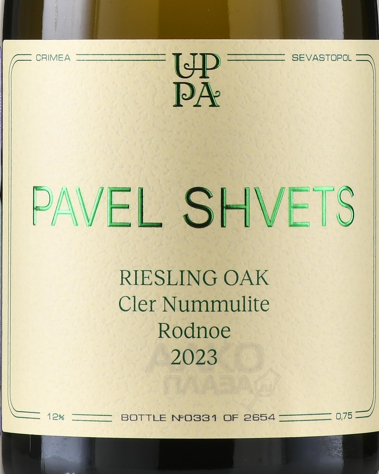 Белое сухое вино Павел Швец Рислинг Оак Клер Нуммулит Родное 0.75 л белое сухое 0,75 л изготовлено из сырья с виноградника Cler Nummulite (3 клетка/участок), который располагается в долине Черной реки. Сбор урожая осуществлялся ручным способом в начале октября. Проводились полное гребнеотделение и криомацерация (24 часа). Далее сусло бережно отжали и ферментировали, затем вино выдерживали во французских бочках (228 и 500 л) на протяжении 13 месяцев. Еще полгода оно дозревало в стальных резервуарах. Потенциал в бутылке — 7 лет.