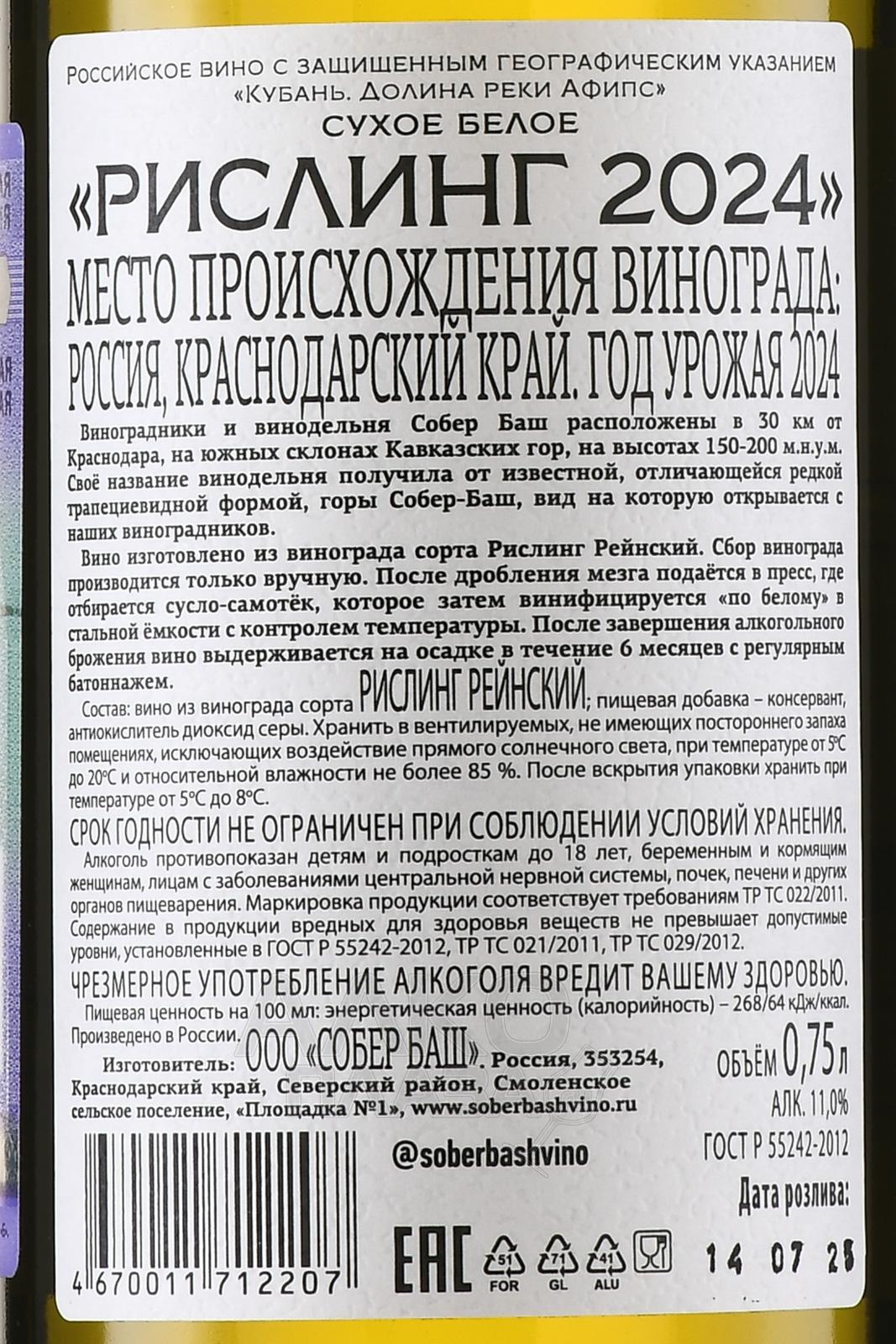 Белое сухое вино Рислинг Собер Баш 2021 г. 0,75 л из отборного винограда, выращенного в тридцати километрах от города Краснодара на южных участках живописных Кавказских гор, является моносепажным из-за состава (в нем представлен один сорт). Классическое производство без добавления искусственных составляющих протекало под неусыпным контролем качества со стороны сотрудников отечественной компании и новейшего автоматизированного оборудования. По завершении ручного сбора урожай отправился ферментироваться в стальную терморегулируемую тару, затем вино на пять месяцев налили в дубовые баррики, где проводилась выдержка с батонажем.