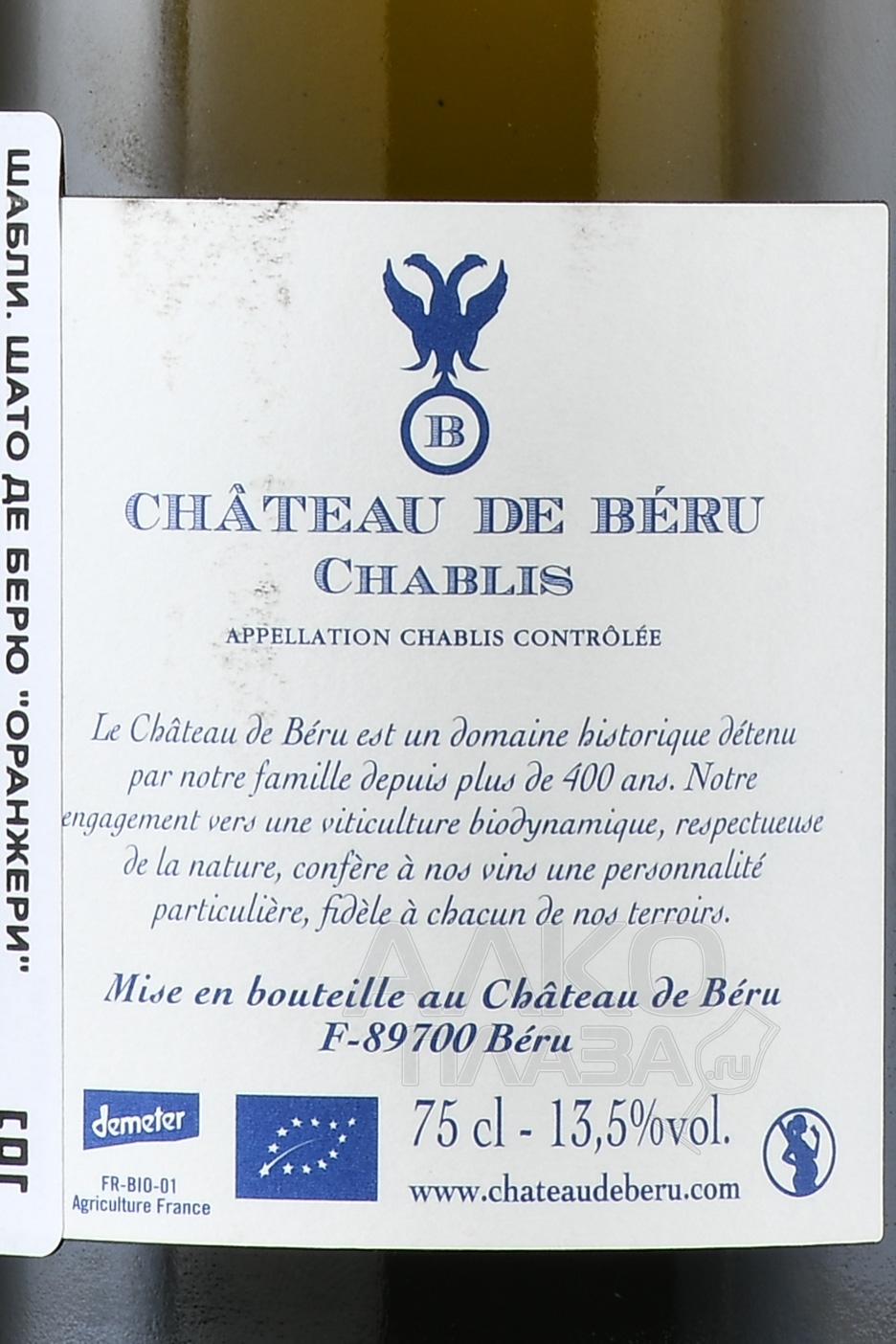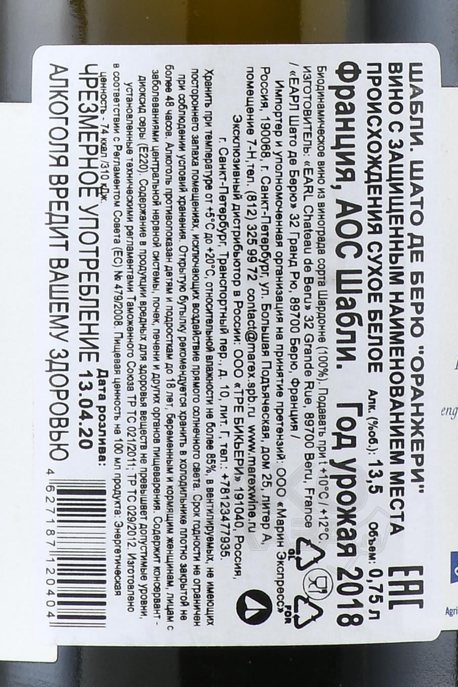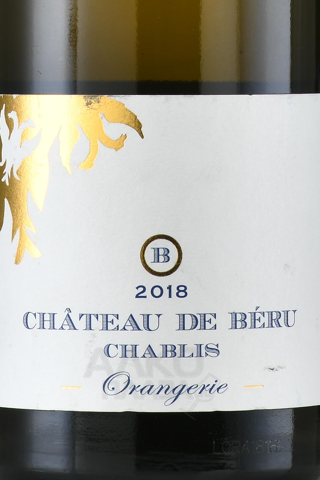 Белое сухое вино Chateau de Beru Orangerie Chablis AOC 0.75 л изготавливается из одного сорта, выращенного на маленьком участке виноградника Кло Беру. Он окружен яблонями, грушами и фиговыми деревьями и напоминает экзотический сад. Отсюда и название вина — Оранжери. Урожай с лоз, которые растут на глинисто-меловой почве, собирают вручную. Сусло сбраживают в стальных чанах на натуральных дрожжах. Вино выдерживают в бочках из старого дуба 18 месяцев и разливают без фильтрации и добавления сульфида серы.