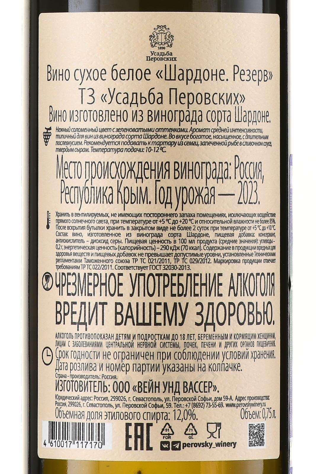 Белое сухое вино Шардоне Резерв Усадьба Перовских 0,75 л происходит из богатого крымского терруара. Ягоды для винификации собрали на виноградниках в долине реки Бельбек, рядом с посёлком Любимовка под Севастополем. Терруар — известняково‑глинистые почвы, мягкий субтропический климат, южные склоны. Ферментация проходила в стальных резервуарах при контроле температуры, затем выдержка — 6–9 месяцев в дубовых барриках (американский и французский дуб). Частичное яблочно‑молочное брожение придало напитку мягкость.