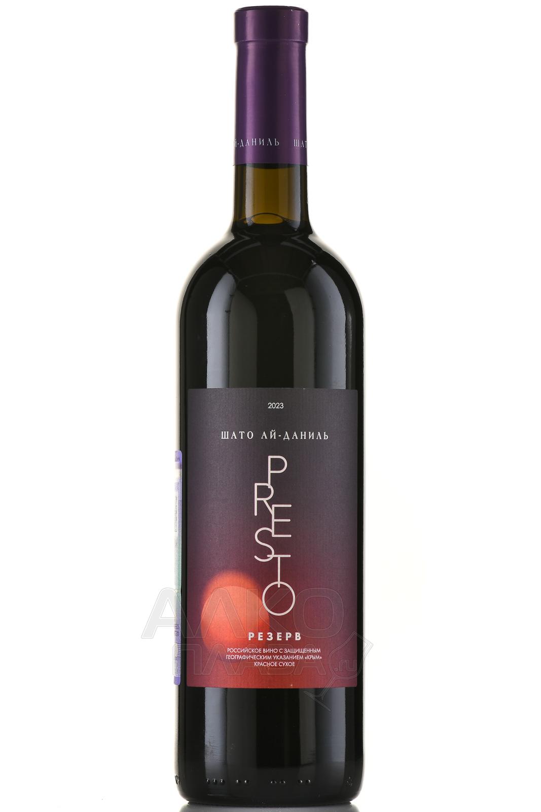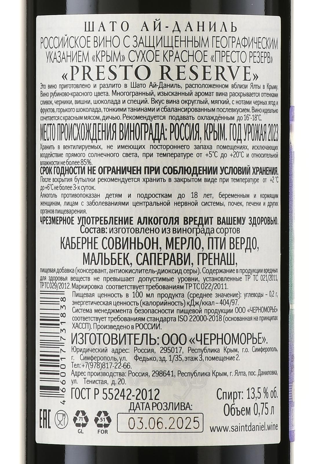 Красное сухое вино Шато Ай-Даниль Престо Резерв 0,75 л производится на южнобережных склонах Крыма, в зоне с благоприятным морским климатом. Виноградники расположены недалеко от села Морское, на известняковых и щебенистых почвах. Эти условия создают насыщенность в ягодах и поддерживают хорошую кислотность. Урожай созрел в условиях жаркого лета с небольшим количеством осадков, благодаря чему ягоды достигли оптимальной зрелости. Напиток создали по классической технологии с выдержкой в дубовых бочках в течение 12 месяцев, что придало купажу сложность, структуру и элегантность без потери сортовых характеристик.