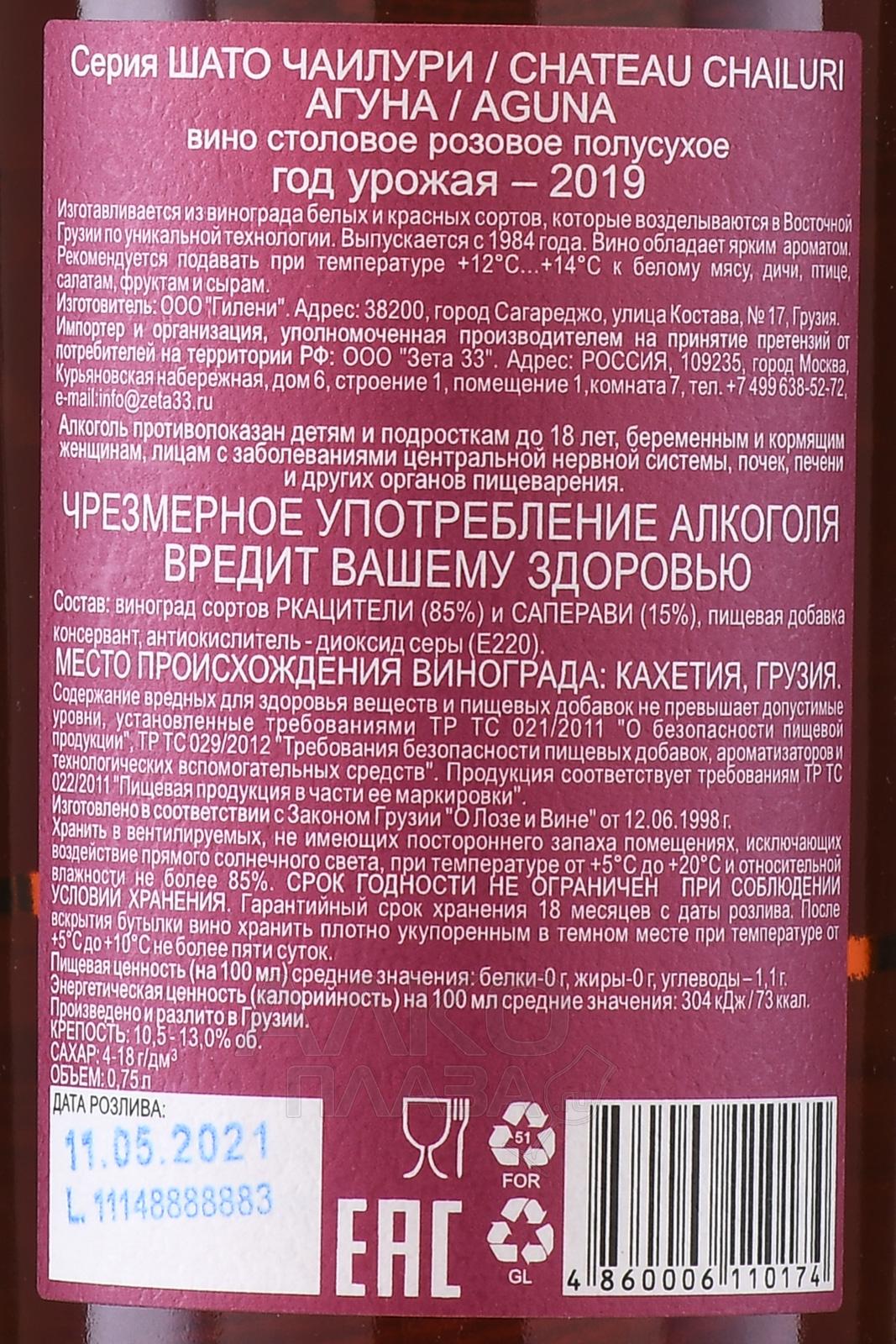Розовое полусухое вино Шато Чаилури Агуна 0,75 л производится в Кахетии, которую по праву называют колыбелью грузинского виноделия. Виноградники расположены на солнечных склонах Алазанской долины, где теплые дни и прохладные ночи способствуют медленному созреванию ягод и накоплению богатого вкусового профиля. Почвы здесь преимущественно аллювиальные и глинисто-известняковые, что придает напитку минеральную основу. Винификация осуществляется из урожаев белого и красного автохтонных сортов, которые выращиваются вручную и проходят бережную переработку. Брожение проводится при контролируемой температуре, что позволяет сохранить свежесть и выразительность аромата. Полусухой стиль подчеркивает естественную фруктовость и делает купаж универсальным для разных гастрономических сочетаний.