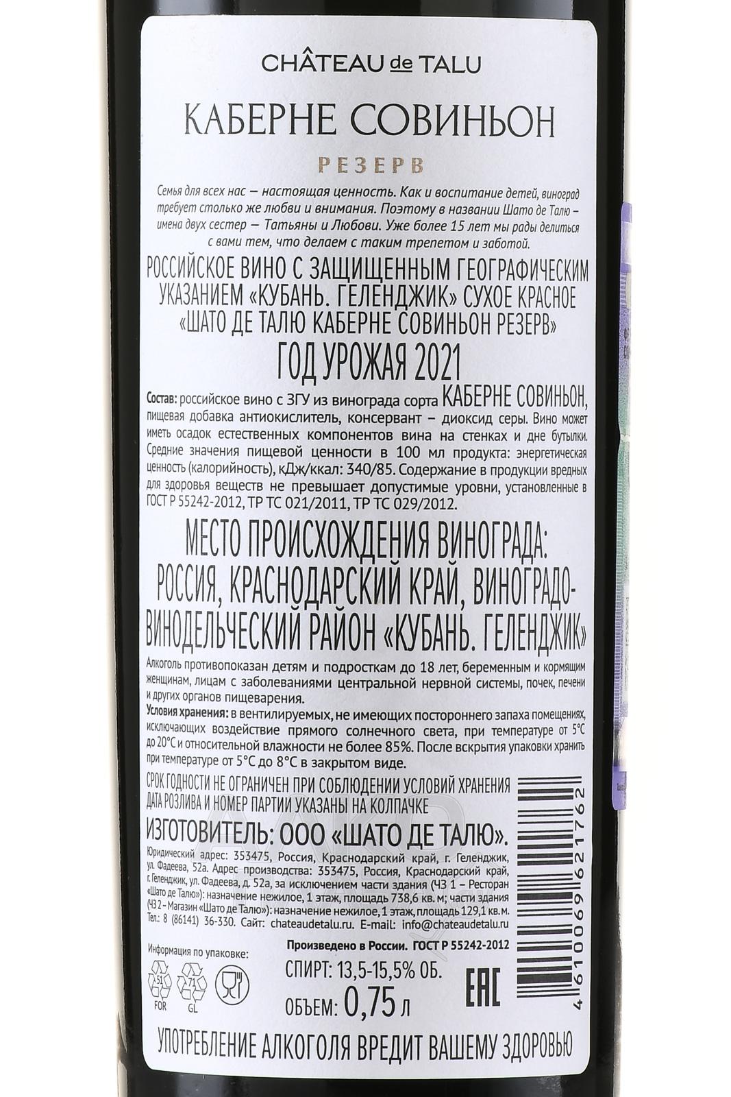 Красное сухое вино Chateau de Talu Cabernet Sauvignon Reserve ЗГУ 0,75 л изготовлено из популярного европейского сорта, который был выращен в уникальной винодельческой зоне с защищенным наименованием «Кубань. Геленджик». Лозы здесь растут на хорошо дренируемых мергелево-известняковыхх почвах в теплом приморском климате. Освежающие бризы смягчают жару и уносят излишки влаги, благодаря чему качество урожая повышается. Винификация осуществляется традиционным способом, затем вино проходит выдержку на протяжении 20 месяцев в бочонках из французского дуба.
