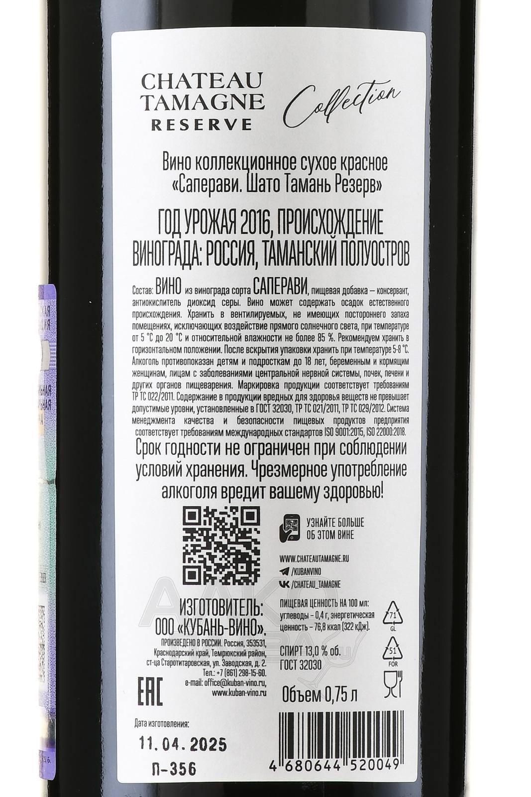 Красное сухое вино Шато Тамань Резерв Саперави Коллекционное 2016 г. 0,75 л создано как выразительное выдержанное кюве, в котором популярный грузинский сорт показывает максимальную плотность и глубину цвета. Виноград выращивают на Таманском полуострове, где комбинация морских бризов и тёплого климата формирует длительный вегетационный период. Почвы здесь разнородные: ракушечник, глинистые слои, песчаник. Такая среда позволяет ягодам накапливать высокий уровень антоцианов и концентрированную фенольную структуру. Сбор провели вручную, следуя строгому отбору и сортировке. Брожение проходило в небольших чанах при контролируемой температуре, чтобы сохранить фруктовость и точность букета. После ферментации напиток оставили созревать в дубе от 12 до 16 месяцев, затем несколько лет — в бутылке.
