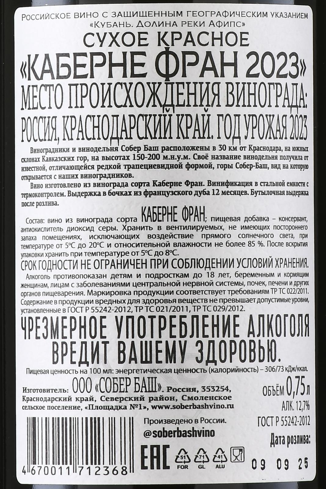 Красное сухое вино Собер Баш Каберне Фран 0,75 л создается в 30 км от Краснодара, на южных склонах Кавказских гор, на высоте 150–200 метров над уровнем моря. Название винодельни связано с горой, чья редкая трапециевидная форма стала символом местного терруара. Почвы здесь глинисто-известковые, богатые минералами, а микроклимат сочетает жаркое солнце и прохладные ветра, приходящие с Черного моря. Виноград выращивают без агрессивной химии, с бережным отношением к лозам. Урожай собирают вручную в оптимальной стадии зрелости. Винификация проходит в стальной емкости с температурным контролем, после чего напиток выдерживают 12 месяцев в бочках из французского дуба.
