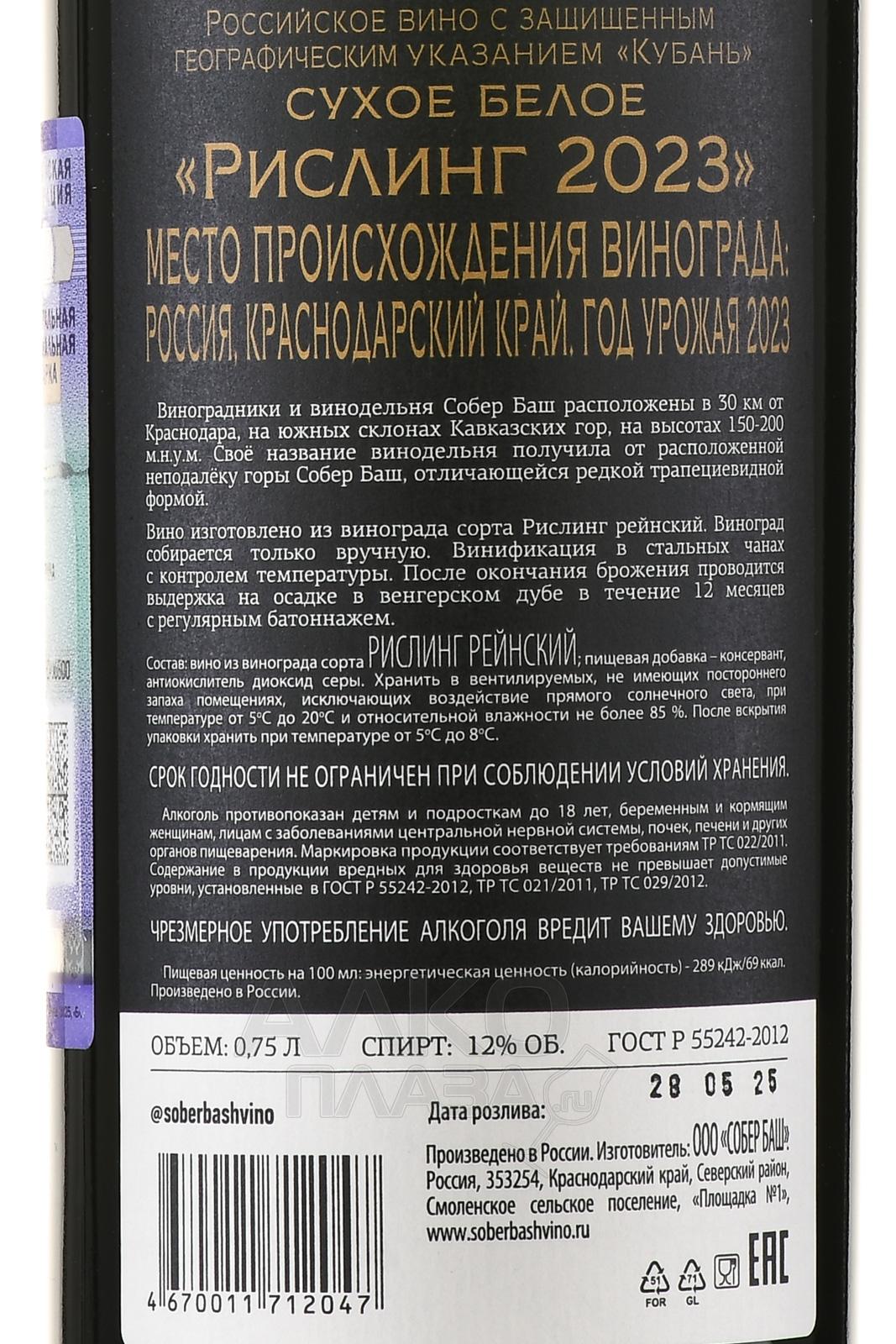 Белое сухое вино Собер Баш Рислинг 0,75 л — это российский моносортовой образец, созданный в Краснодарском крае. Виноградники расположены в терруаре Кубани, в долине реки Афипс, на южных склонах высотой около 150 метров над уровнем моря. Почва здесь богата мергелем и доломитом, что отражается в минеральных мотивах напитка. Плотность посадки лоз — около 5166 на гектар. После сбора урожая отжатый путём прессования сок сбродили при низких температурах 12–14 °C в ёмкостях из нержавеющей стали без малолактической ферментации. Выдержка проходила на тонком осадке не менее 5–6 месяцев, применялся регулярный батонаж для придания большей глубины и ароматики.