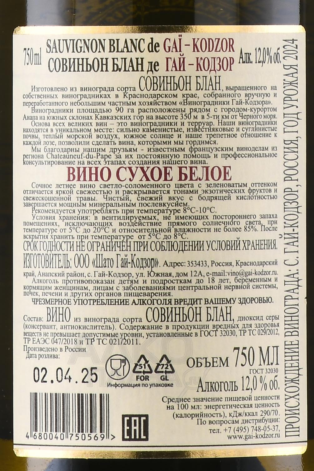 Белое сухое вино Совиньон Блан де Гай Кодзор 0.75 л — российский моносепажный напиток с уровнем спиртуозности 12,5 процента, изготовленный из сорта Совиньон Блан, который поспел на виноградниках производителя из Краснодарского края и собран вручную в определенный год. Виноградники частного хозяйства площадью 90 гектаров расположились недалеко от Анапы на высоте 350 м над уровнем Черного моря. Они имеют уникальный терруар, морской воздух, яркое солнце и почвы, богатые известняковыми и суглинистыми почвами.