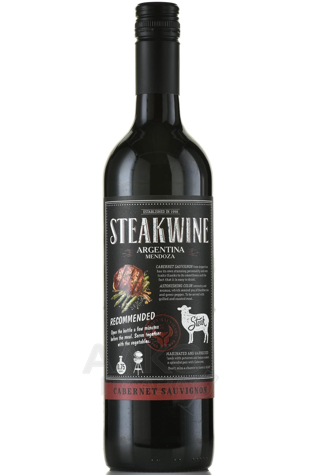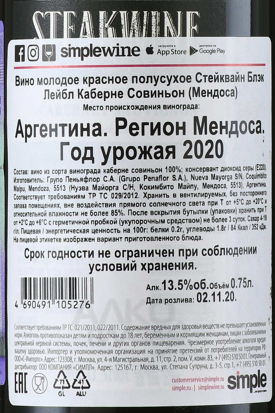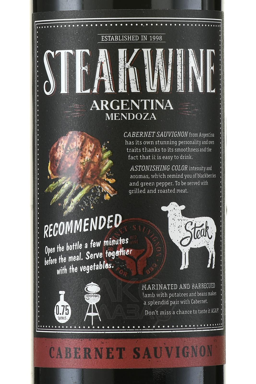 Красное полусухое вино Steakwine Cabernet Sauvignon Black Label 2017 г от аргентинского производителя отличается гарантированным качеством и доступной ценой. Крепость вариации равна 12,5%. Винтаж из Мендосы изготовлен на базе спелого винограда европейского сорта путем винификации сусла при постоянном контроле температурного режима. Напиток предлагается молодым, его потенциал хранения не превышает трех лет.