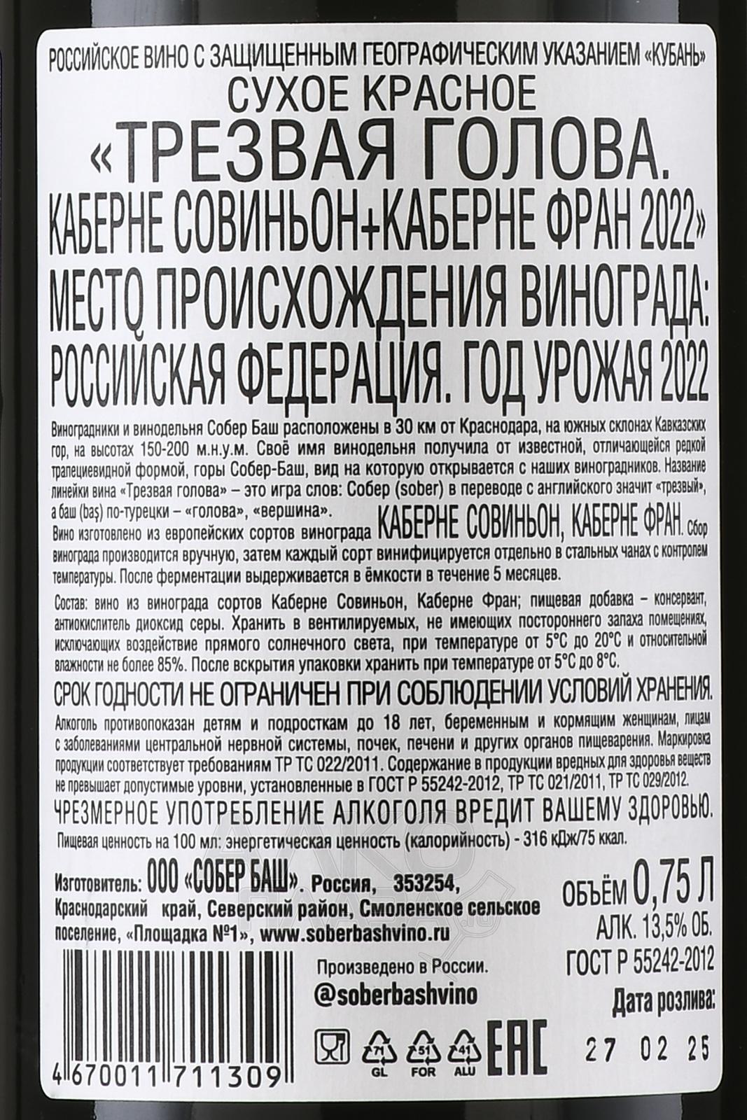 Красное сухое вино Собер Баш Трезвая голова Каберне Совиньон+Каберне Фран ЗГУ 2021 г. 0,75 л сделано из кубанского винограда, который выращивается у подножия Кавказских гор. Возраст лоз — 8-10 лет. Виноградники разбиты на глинистом грунте с высоким содержанием железа и ориентированы на юг и юго-запад. Каждый из двух используемых сортов проходит индивидуальную винификацию. Сбор сырья осуществляется на пике зрелости вручную. Ферментация протекает в стальных чанах с контролем температуры. Алкогольное брожение занимает 1 неделю, далее следует этап малолактики. Вино выдерживается в стали несколько месяцев.