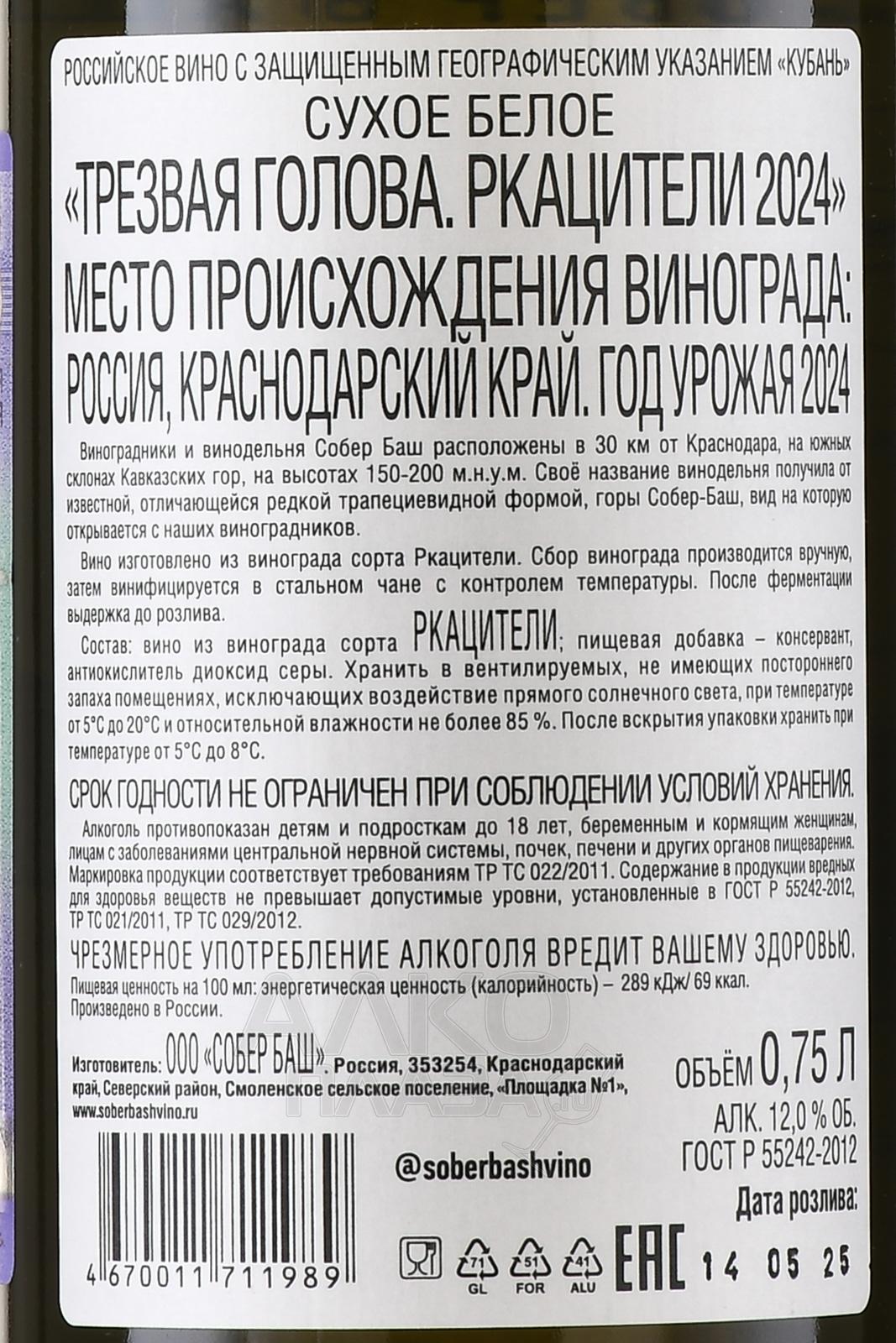 Белое сухое вино Собер Баш Трезвая голова Ркацители ЗГУ 2022 г. 0,75 л родом из уникального кубанского терруара, который располагается в долине реки Афипс. Подобных ему в России немного. Горный виноградник с сортом Ркацители разбит на окруженном лесом участке на высоте 150 м у подножия Кавказского хребта. Он имеет южную экспозицию и лесные почвы. Возраст лоз — 8 лет. Ручной сбор урожая осуществляется на пике зрелости. Алкогольная ферментация протекает в стальных терморегулируемых резервуарах, малолактика не производится. Вино выдерживается в стали на протяжении 6 месяцев.