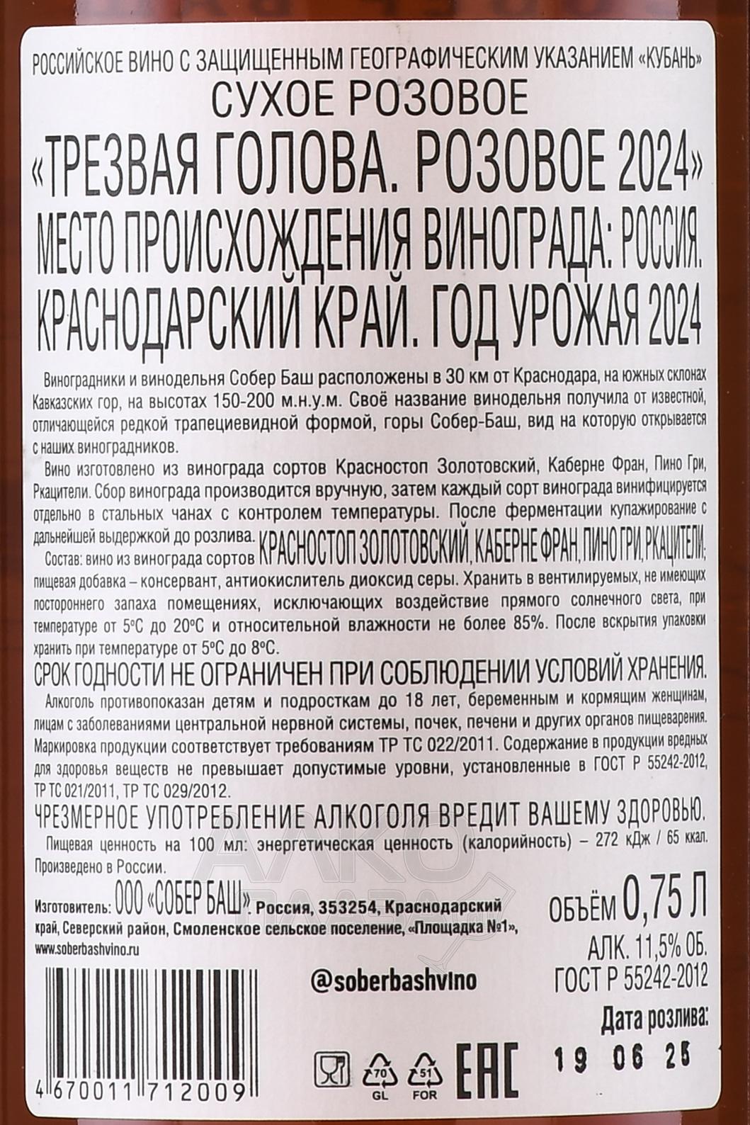 Розовое сухое вино Собер Баш Трезвая голова ЗГУ 2022 г. 0,75 л изготавливается из 3 сортов по классической технологии. Сырье выращивается в уникальном терруаре Кубани в предгорьях Кавказа на высоте 150-200 м. Лозы растут на глинистых, богатых железами почвах, на южных и юго-западных склонах, получая максимальное количество солнечного тепла и света. Урожай собирается вручную. Сорта проходят раздельную винификацию, а купаж составляется в самом конце. После тщательной ручной сортировки ягоды дробят, сусло ферментируют в стали с контролем температуры. Вино 5 месяцев выдерживается в стальных резервуарах на осадке с постоянным батонажем (перемешиванием).