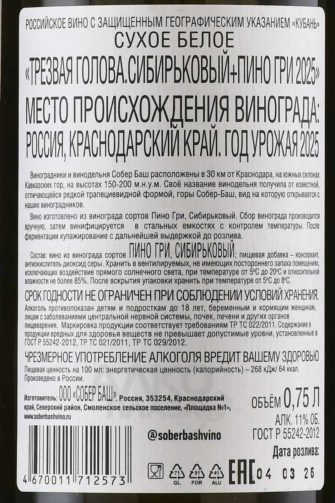 Белое сухое вино Трезвая голова Сибирьковский+Пино Гри 0,75 л изготовлено из винограда ручного сбора, который был выращен в долине реки Афипс (Кубань) на собственных угодьях винодельни Собер Баш. Посадки с лозами (2012 года) располагаются на высоте 150-200 м на южных склонах Кавказских гор в окружении дубовых лесов. Винификация проводилась по классической технологии (алкогольная терморегулируемая ферментация в стали без малолактики). Вино проходило выдержку полгода в стальных резервуарах на тонком дрожжевом осадке.