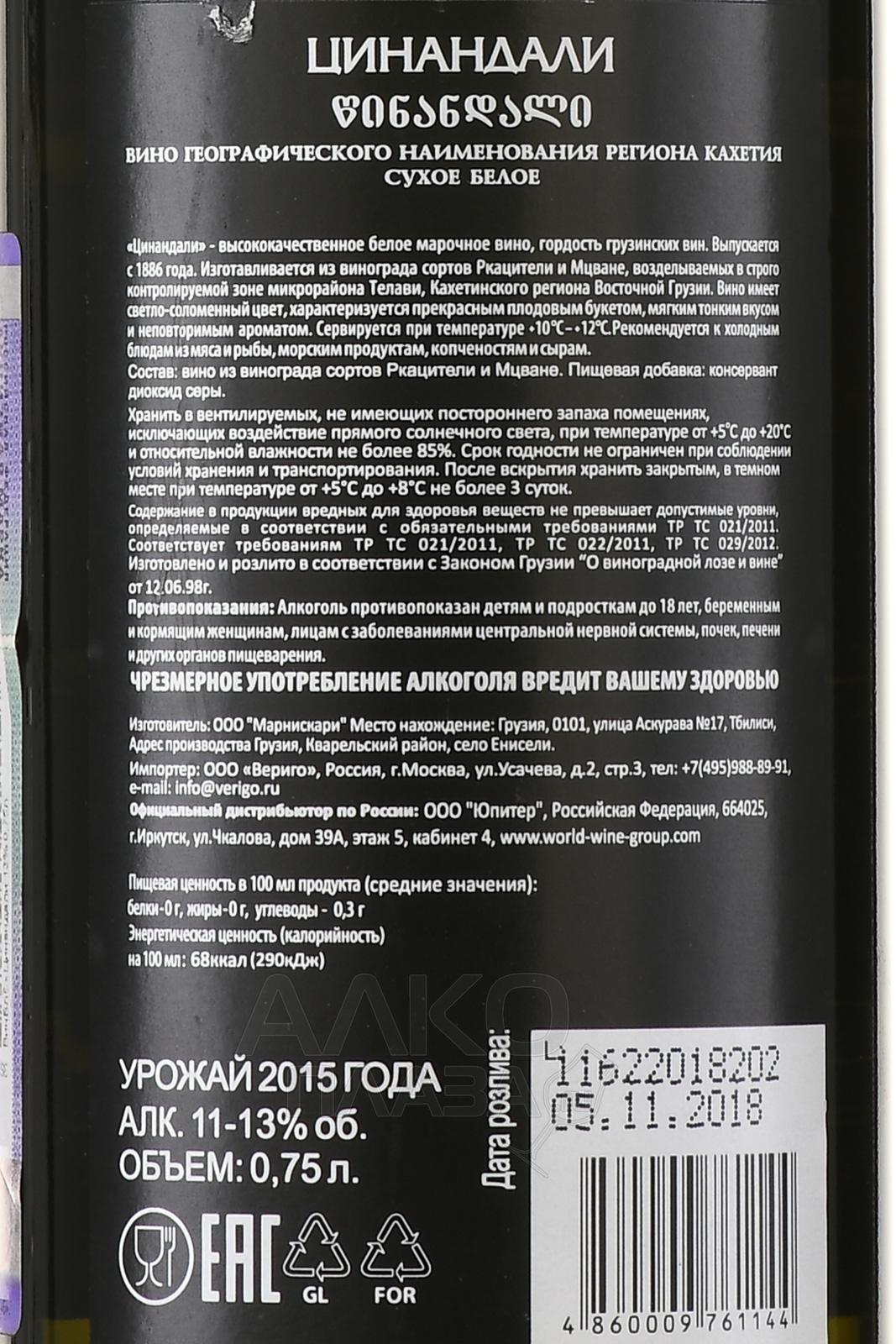 Белое сухое вино Marniskari Tsinandali 0,75 л производят из классических грузинских автохтонных сортов Ркацители и Мцване, растущих в Кахетии. Оптимальные климатические условия специфической зоны цинандальских виноградников наделяют созревший урожай исключительными вкусовыми свойствами, что в совокупности с традиционной грузинской технологией винификации дает неповторимый букет. Вино разливают при крепости 11-13% в лаконичную бутылку из прозрачного стекла с черно-золотой этикеткой.