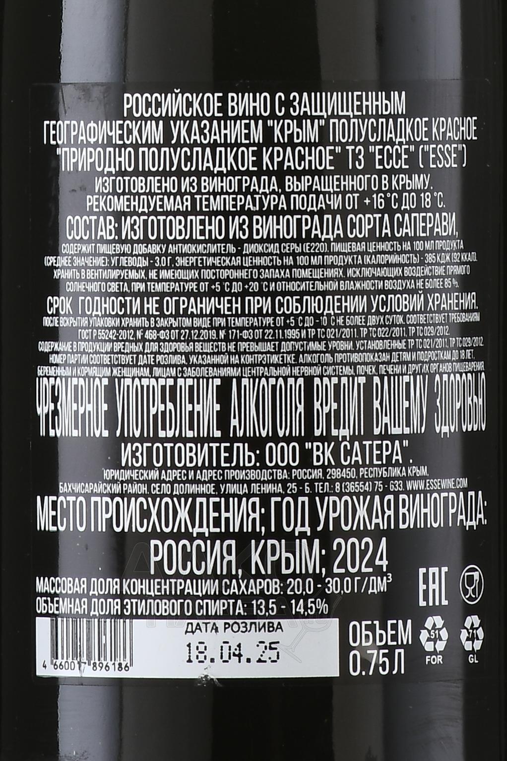 Полусладкое красное вино ESSE Природно-полусладкое 2024 г. 0,75 л – натуральный напиток из винограда Саперави. Сырье вырастили в Долине реки Кача на западном побережье Крыма, на высоте около 300 метров над уровнем моря. Терруар отличается карбонатными, хорошо дренированными почвами с высоким содержанием известняка. Погодные условия в сезон сбора были благоприятными для сорта: лето оказалось длинным и тёплым, длилось около 150 дней, с дневными температурами до +32 °C и умеренными осадками в 450 мм за сезон. Такие климатические характеристики способствовали равномерному созреванию ягод, накоплению сахара и необходимой кислотности. Урожай собирали вручную, тщательно отбирая спелые плоды. Винификация велась без выдержки в дубовых бочках, с ферментацией и последующим хранением вина в стальных ёмкостях с контролем температуры.