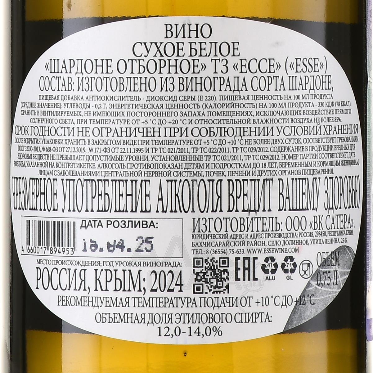 Белое сухое вино ESSE Шардоне Отборное 0,75 л создано из ягод сорта Шардоне, выращенного в долине реки Кача в Крыму. Виноградники расположены на высоте около 300 метров над уровнем моря и занимают делювиально-карбонатные почвы, богатые минералами. Средний возраст лоз составляет 8–10 лет. Урожай формировался при умеренно влажной весне и жарком сухом лете, что способствовало оптимальному накоплению сахара и кислотности в плодах. Сбор проводился вручную в небольшие ящики вместимостью 9–10 кг для сохранения целостности винограда. Винификация осуществлялась с использованием итальянского оборудования De La Toffolo, включая мягкое прессование и контролируемую ферментацию в стальных резервуарах без выдержки в дубе.