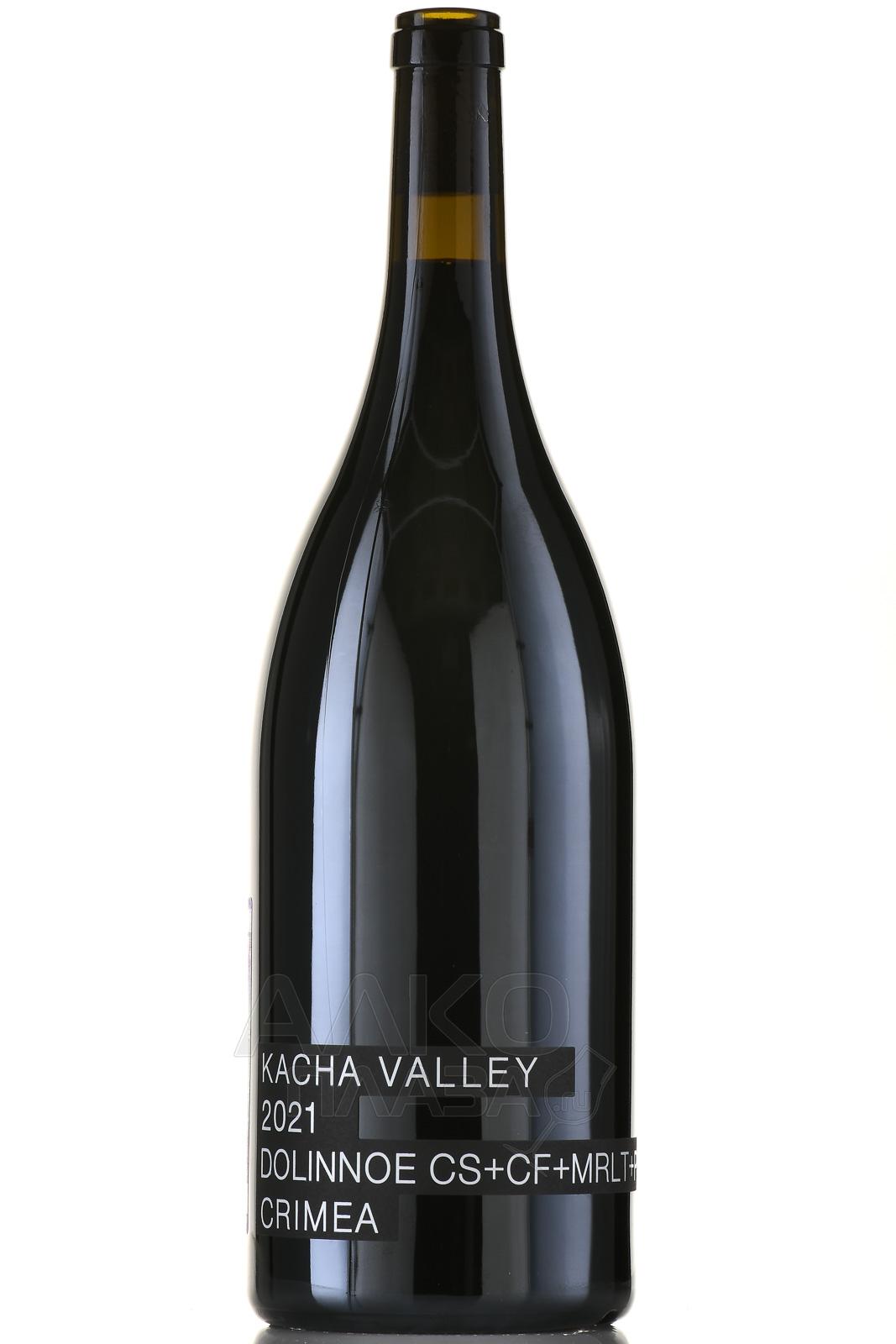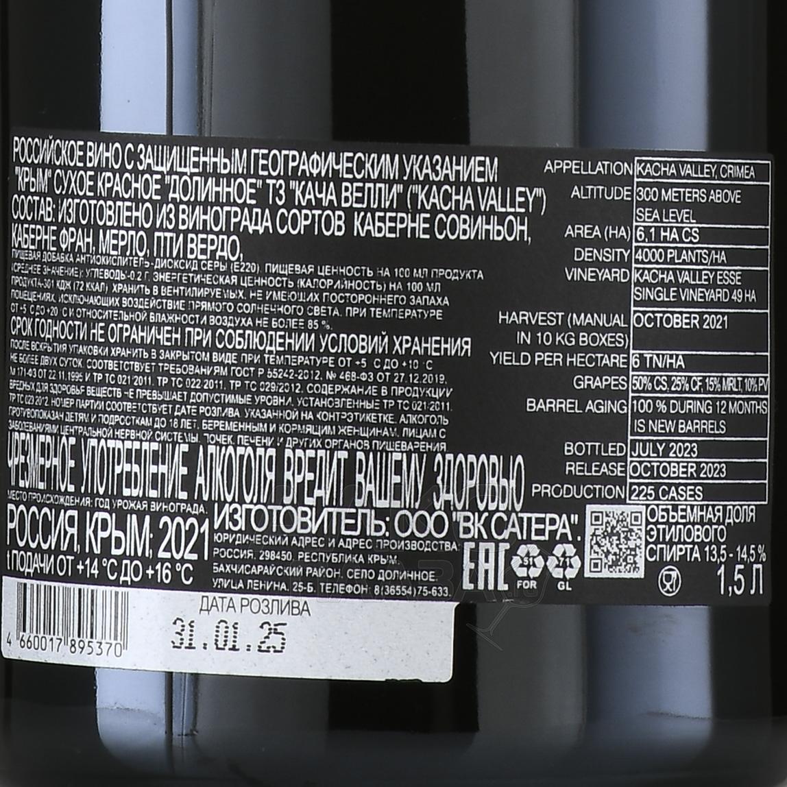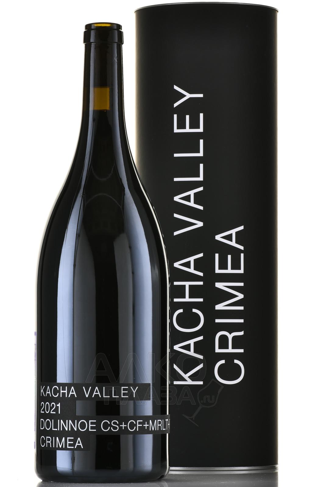 Красное сухое вино Кача Велли Долинное 1,5 л в тубе – терруарный напиток из винограда, выращенного на участках в долине реки Кача в Крыму. В купаже использованы классические бордоские сорта. Лозы, с которых собрали урожай, растут на высоте 150–200 м над уровнем моря на почвах из гальки и известняка, обладающих отличным дренажем. Плотность посадки обеспечивает невысокую урожайность – около 6 тонн с гектара. Плоды собрали вручную в сентябре, когда сахаристость ягод достигла 24–25 °Brix. Каждую разновидность ферментировали отдельно, а затем выдержали купаж от 12 до 14 месяцев в новых дубовых бочках французского происхождения ёмкостью 225 л.