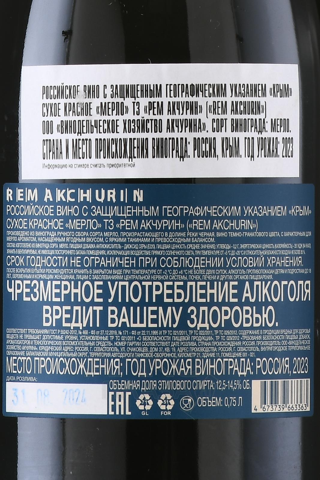 Красное сухое вино Рем Акчурин Мерло 0,75 л создаётся из винограда бордоского сорта, выращенного в Байдарской долине, в окрестностях Севастополя. Терруар отличается известняково-мергельными почвами с примесью юрских и меловых пород, обеспечивающих хороший дренаж и минерализацию будущего напитка. Климат года сбора урожая характеризовался умеренно тёплым летом и мягкой осенью. Средняя температура сезона достигала около +23 °C при небольшом количестве осадков — до 300 мм. Виноград собирают вручную, подвергают классической ферментации с мацерацией на кожице до двух недель при температуре до +28 °C. После этого вино выдерживают от 6 до 8 месяцев в бочках частично из французского дуба, придающих мягкость и округлость.