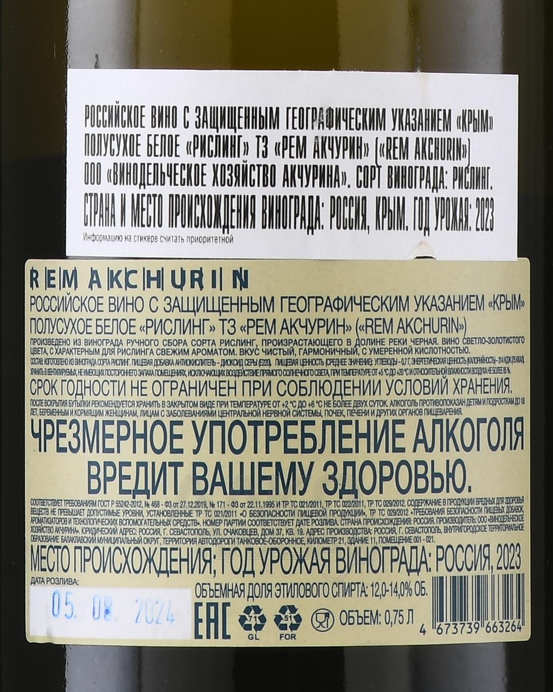 Белое полусухое вино Рем Акчурин Рислинг 0,75 л отличается ярким и элегантным характером. Его производят из ягод популярного европейского и мирового сорта, выращенных в Крыму, в долине реки Чёрная около села Хмельницкое. Терруар характеризуется известняковыми и аллювиальными почвами с хорошей дренажной способностью. Сбор урожая проводится вручную при оптимальной зрелости ягод. Винификация протекает методом холодной мацерации при температуре около 10 °С в резервуарах из нержавеющей стали. Малолактическое брожение не проводится, что позволяет сохранить выразительность сорта и природную кислотность. Выдержка в дубе отсутствует, напиток готов к употреблению сразу после розлива.