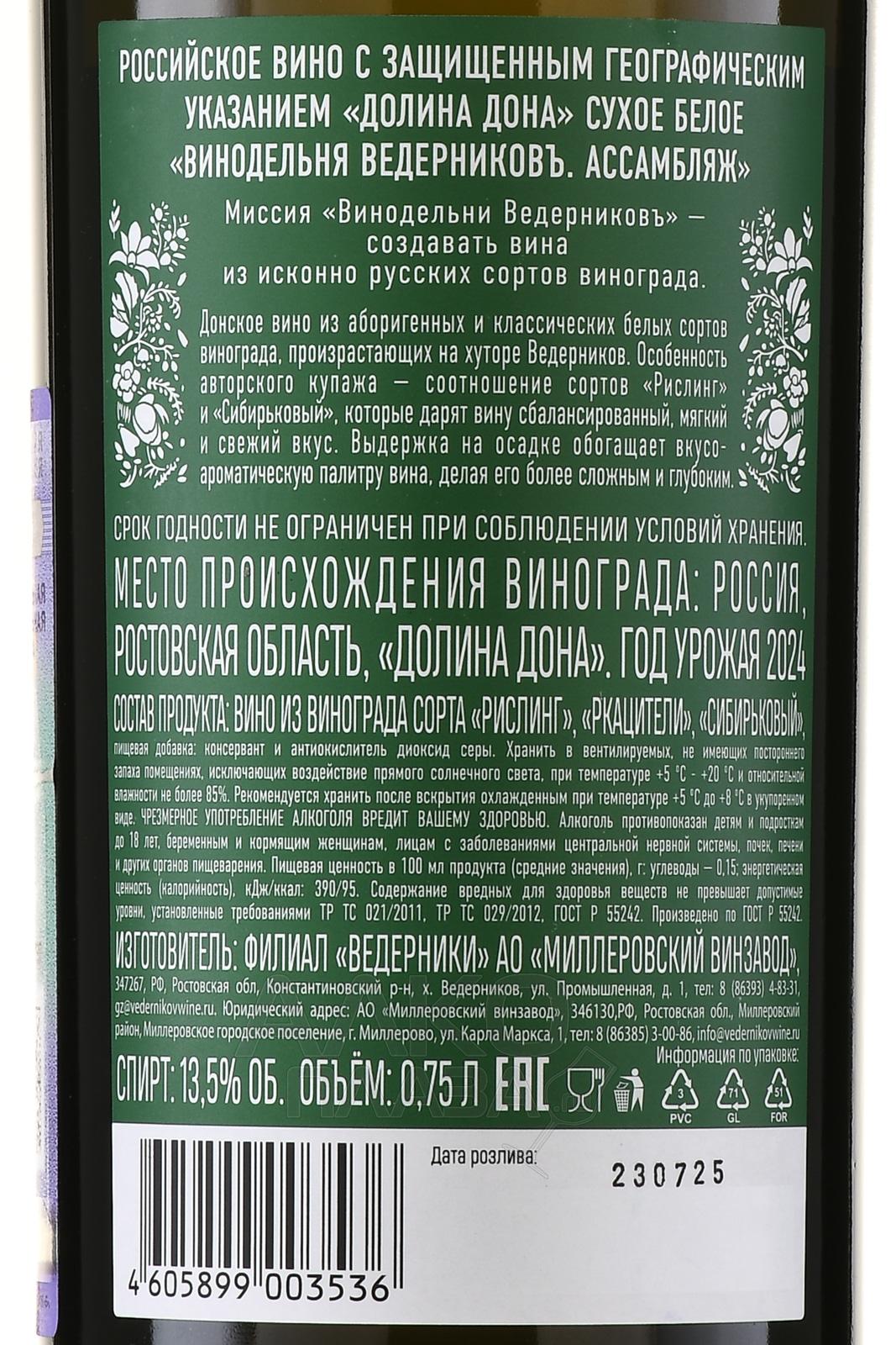 Вино Ведерниковъ Ассамбляж Рислинг Ркацители Сибирьковый 0.75 л белое сухое