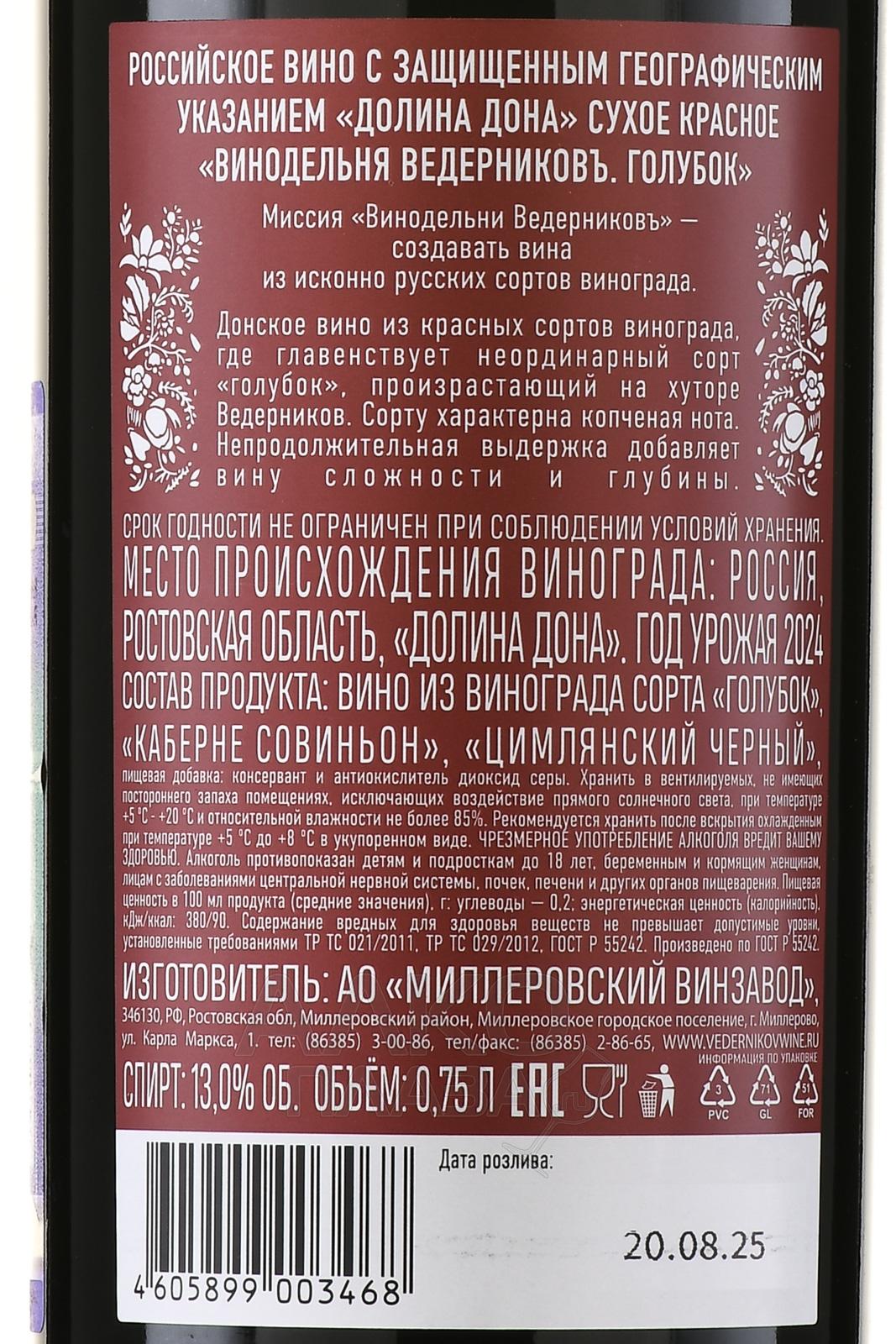 Вино Ведерниковъ Голубок 0.75 л красное сухое