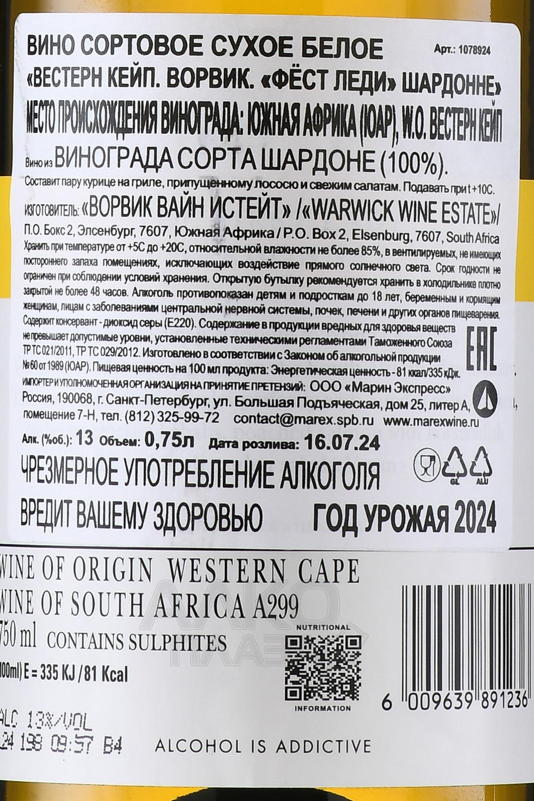 Вино Warwick Estate The First Lady Chardonnay 0.75 л — белый сухой сорт из одного вида винограда, который выращивается в субрегионе Западного Кейпа — Стелленбоше. Урожай собирается вручную по достижении оптимальной спелости сырья. Его сразу отправляют на винодельню, прессуют, затем сусло ферментируют: 92% в стальных чанах и 8% в дубовых бочках. Выдержка на осадке протекает 100 дней, после чего составляется купаж. Вино разливают в бутылки в августе. В стекле оно может развиваться еще 1-4 года.