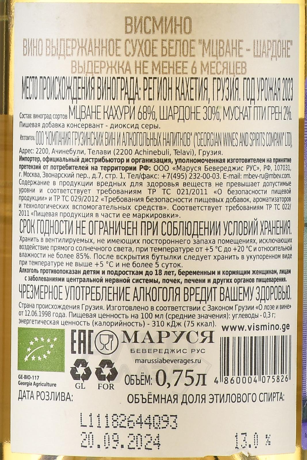 Белое сухое вино Висмино Мцване Шардоне 0,75 л – это лёгкий купаж из региона Кахетия, созданный из ягод грузинского автохтона и двух французских сортов. Урожай собрали вручную в конце сентября с виноградников, расположенных на высоте 300–500 метров над уровнем моря. Почвы здесь преимущественно известковые и глинистые, что обеспечивает минеральные нюансы будущего напитка. После сбора плоды аккуратно прессовали, ферментация отжатого сока проходила при контролируемой температуре 15–17 °C в стальных ёмкостях.