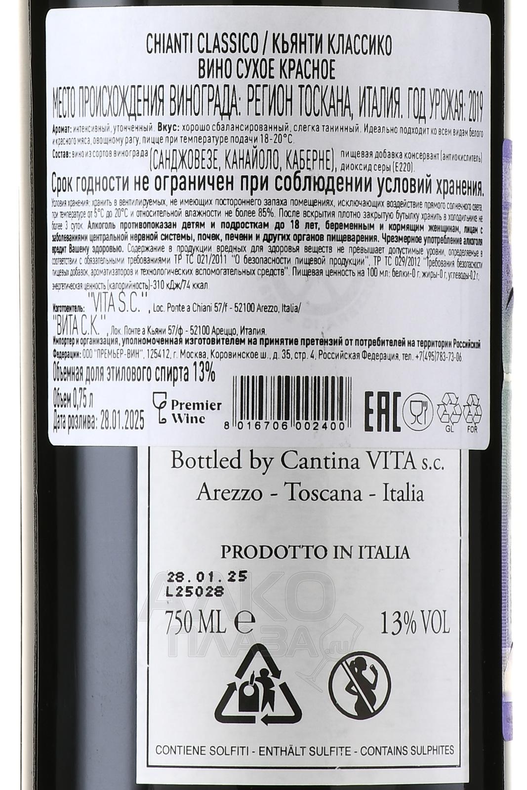 Красное сухое вино Vita Chianti Classico 0,75 л производится в центральной части Тосканы, в зоне между Флоренцией и Сиеной. Виноградники находятся на холмистых склонах на высотах в среднем от 250 до 500 метров над уровнем моря. Терруар формируется сочетанием известняковых и глинисто-сланцевых почв, а также умеренного климата с тёплыми днями и прохладными ночами. Такие условия способствуют равномерному созреванию ягод, сохранению кислотности и формированию структурированных напитков с выраженным сортовым характером и устойчивым балансом. Вино производится в соответствии с регламентом Кьянти Классико DOCG, который предусматривает использование винограда, выращенного исключительно в пределах зоны апелласьона. Основу купажа составляет сорт Санджовезе, допускается добавление других разрешённых местных сортов в ограниченном объёме. После ферментации следует обязательная выдержка не менее 12 месяцев в дубовых ёмкостях и бутылках.