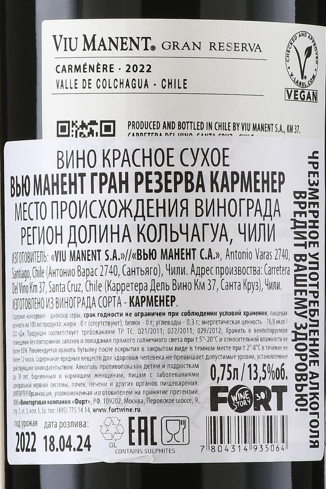 Viu Manent Gran Reserva Carmenere - вино Вью Манент Гран Резерва Карменер 0.75 л красное сухое