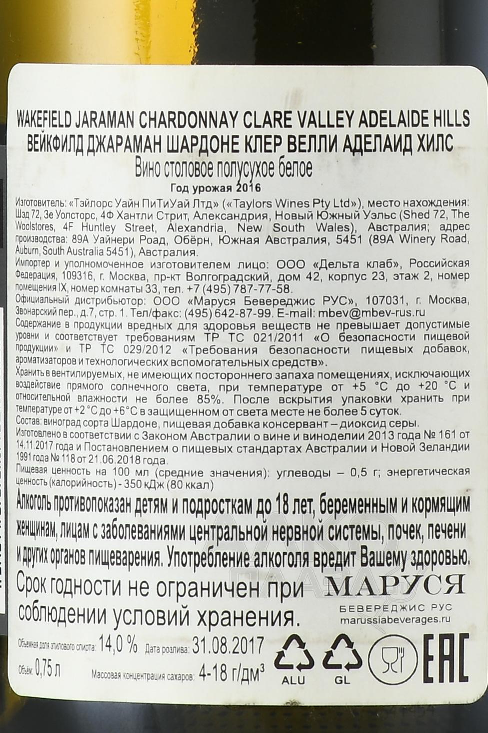 Белое полусухое вино Wakefield Jaraman Chardonnay 0,75 л — моносортовой алкоголь, объединивший в составе виноград с лучших участков Южной Австралии. Сбор урожая осуществили в ранние утренние часы для предотвращения преждевременного брожения. Перед ферментацией в барриках первого и повторного наполнения ягоды спрессовали для получения сока. Завершающим этапом провели восьмимесячную выдержку в бочках.