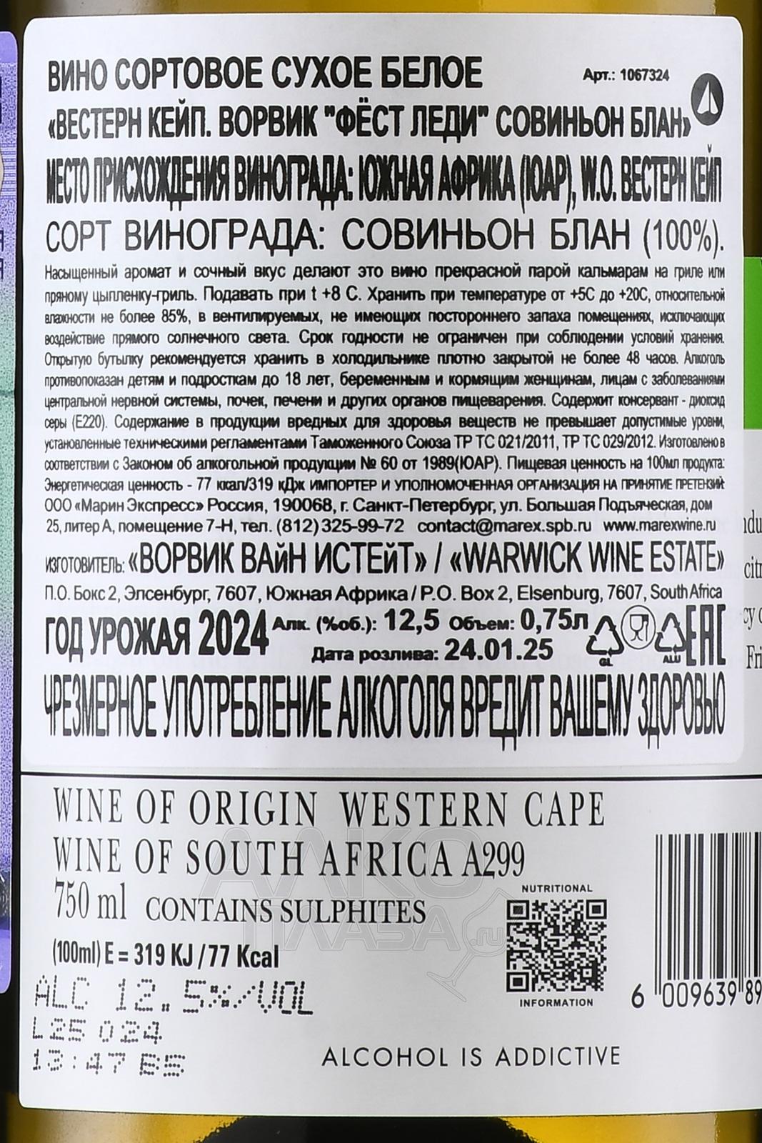 Вино Warwick Estate The First Lady Sauvignon Blanc 0.75 л — сухая белая моносепажная разновидность из Западного Кейпа. Сырье для производства поступает из субрегиона Стелленбош. Здесь виноградники разбиты на высоте 240-360 м на юго-восточных склонах горы Симонсиг. Ягоды собирают ручным способом на пике спелости, избавляют от веточек и прессуют. Сусло мацерируют на мезге примерно 10-12 часов, затем отжимают и перекачивают в емкости из нержавеющей стали. Ферментация протекает медленно при контролируемой пониженной температуре. После завершения процесса вино еще некоторое время выдерживается на осадке, затем разливается в изящные стеклянные бутылки. Потенциал хранения этого напитка составляет 3-4 года.
