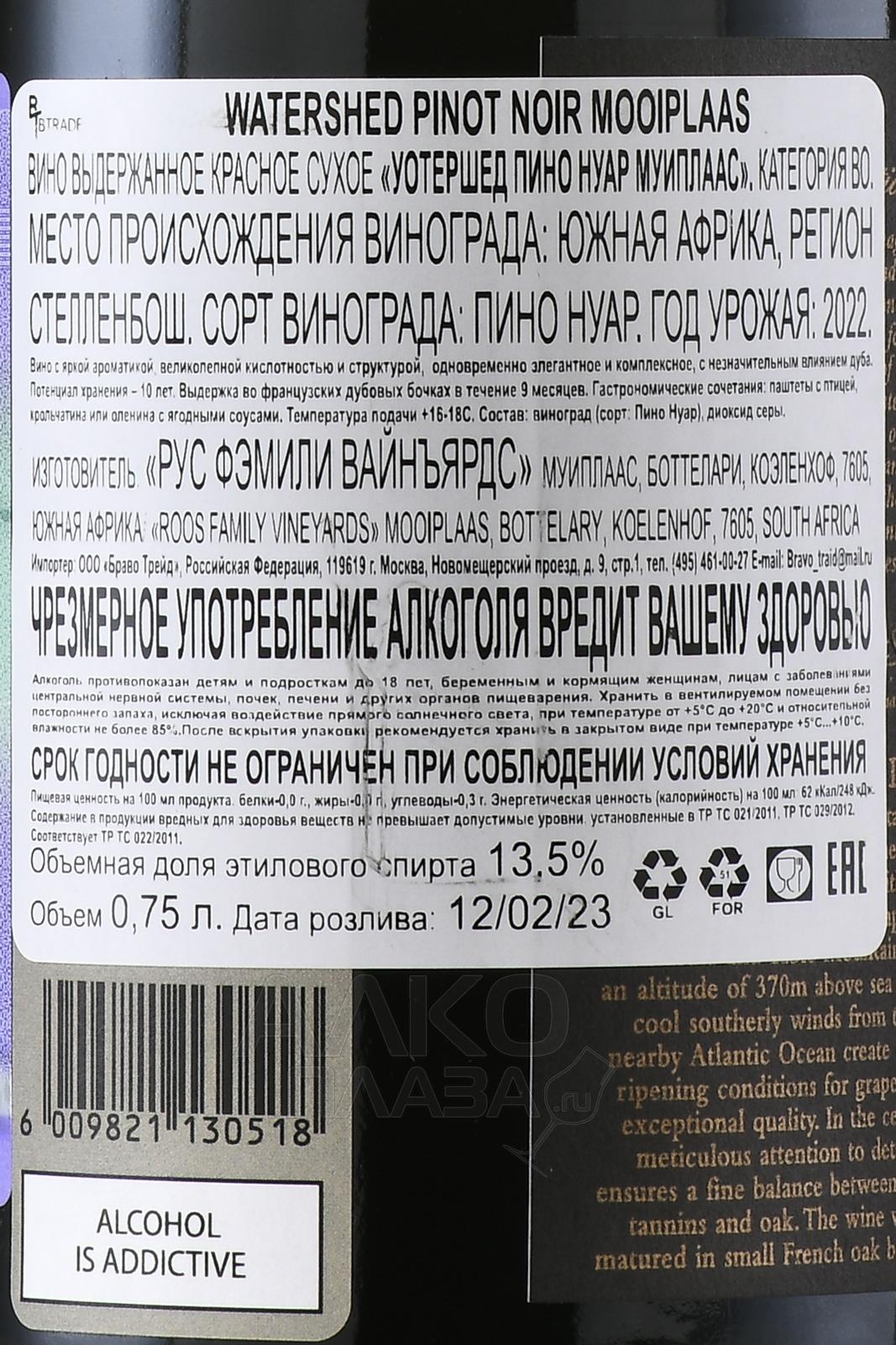 Красное сухое вино Watershed Pinot Noir Mooiplaas 0,75 л – образец из жаркой Южной Африки, способный составить конкуренцию величественным бургундским аналогам. Напиток происходит из престижного винодельческого региона Стелленбош. Ягоды, собранные в течение одного сезона на разных участках, придали купажу сложный и насыщенный характер, а выдержка в дубовых бочках на протяжении 9 месяцев наделила вариацию элегантными древесно-пряными нотками.