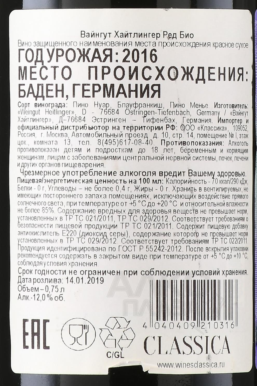 Красное сухое вино Weingut Heitlinger 2016 г. 0,75 л представлено составом из трех сортов винограда ручного сбора, который проводился на угодьях Бадена (южного винодельческого региона Германии) и был ограничен 2016 годом. Мацерации подверглись цельные ягоды с косточками и кожицами. Полученное таким образом сусло сбраживалось при поддерживаемой температуре в стальной таре. Также эти емкости выбрали для недолгой выдержки вина 12-градусной спиртозности.