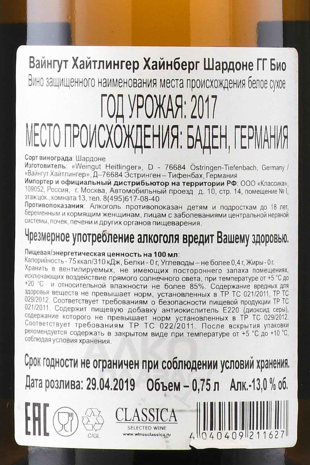 Белое сухое вино Weingut Heitlinger Heinberg Chardonnay GG 2017 г. 0,75 л отличается средней 13-градусной крепостью, а в его составе только один сорт — Шардоне с виноградников Германии. На этих угодьях, сложенных мергелем и древними породами известняка, практикуют органические методики возделывания лозы. Изготовление вина провели путем ферментации в стали и дубе с последующим вызреванием в древесных барриках разного размера.