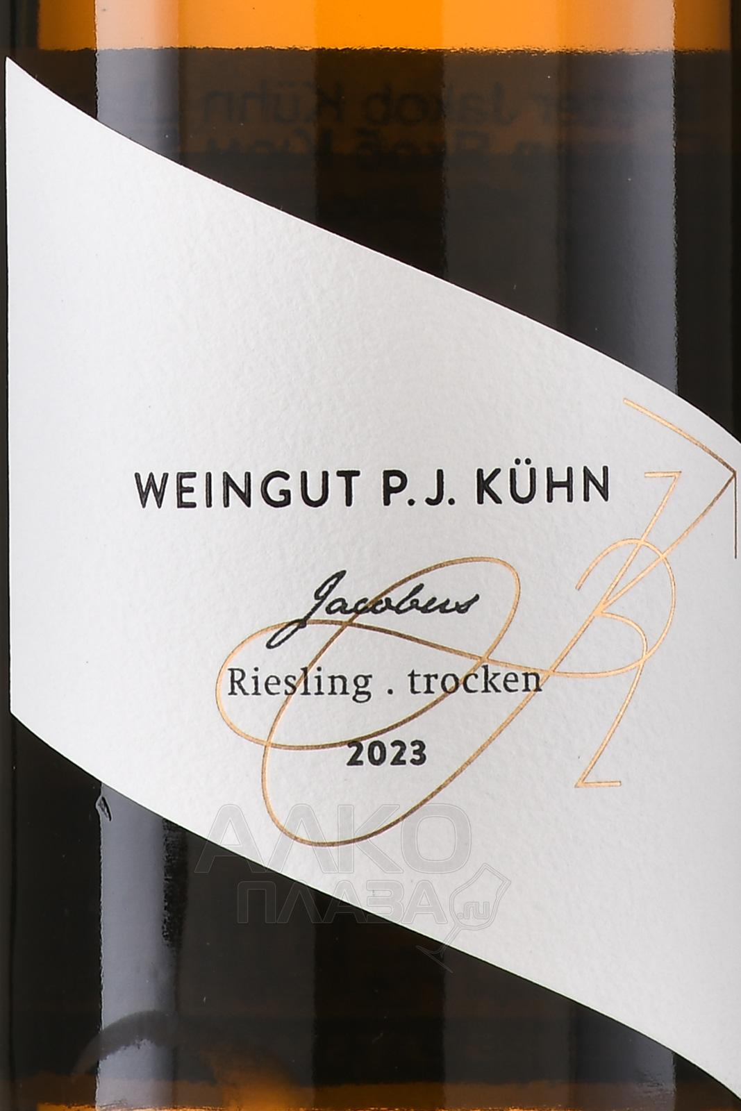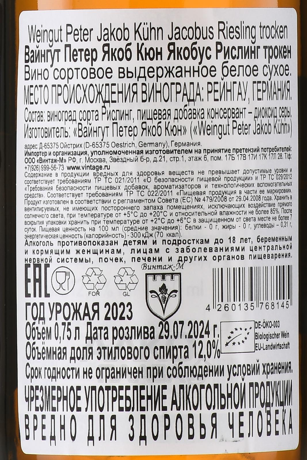 Белое сухое вино Weingut Peter Jakob Kuhn Jacobus Riesling Trocken 0,75 л производится в регионе Рейнгау, который считается одним из главных центров классического немецкого виноделия. Виноградники расположены на берегах Рейна, где глинисто-лёссовые почвы с высоким содержанием кварца и сланца дают ягодам яркую минеральность. Лозы выращиваются по принципам органического и биодинамического земледелия, без использования синтетической химии. Это кюве — визитная карточка хозяйства, получившая название в честь предков семьи Кун. Сбор урожая для его создания проводится вручную, чтобы сохранить целостность ягод. Винификация проходит в больших дубовых фудрах с дикими дрожжами, что подчеркивает естественный характер напитка.