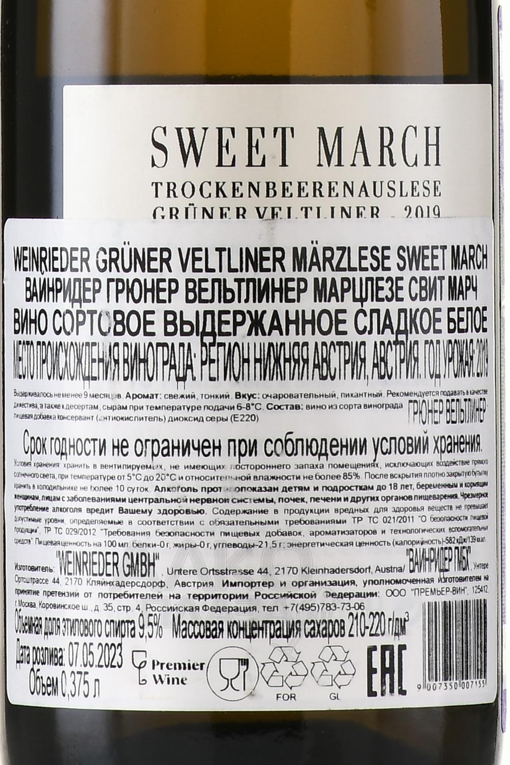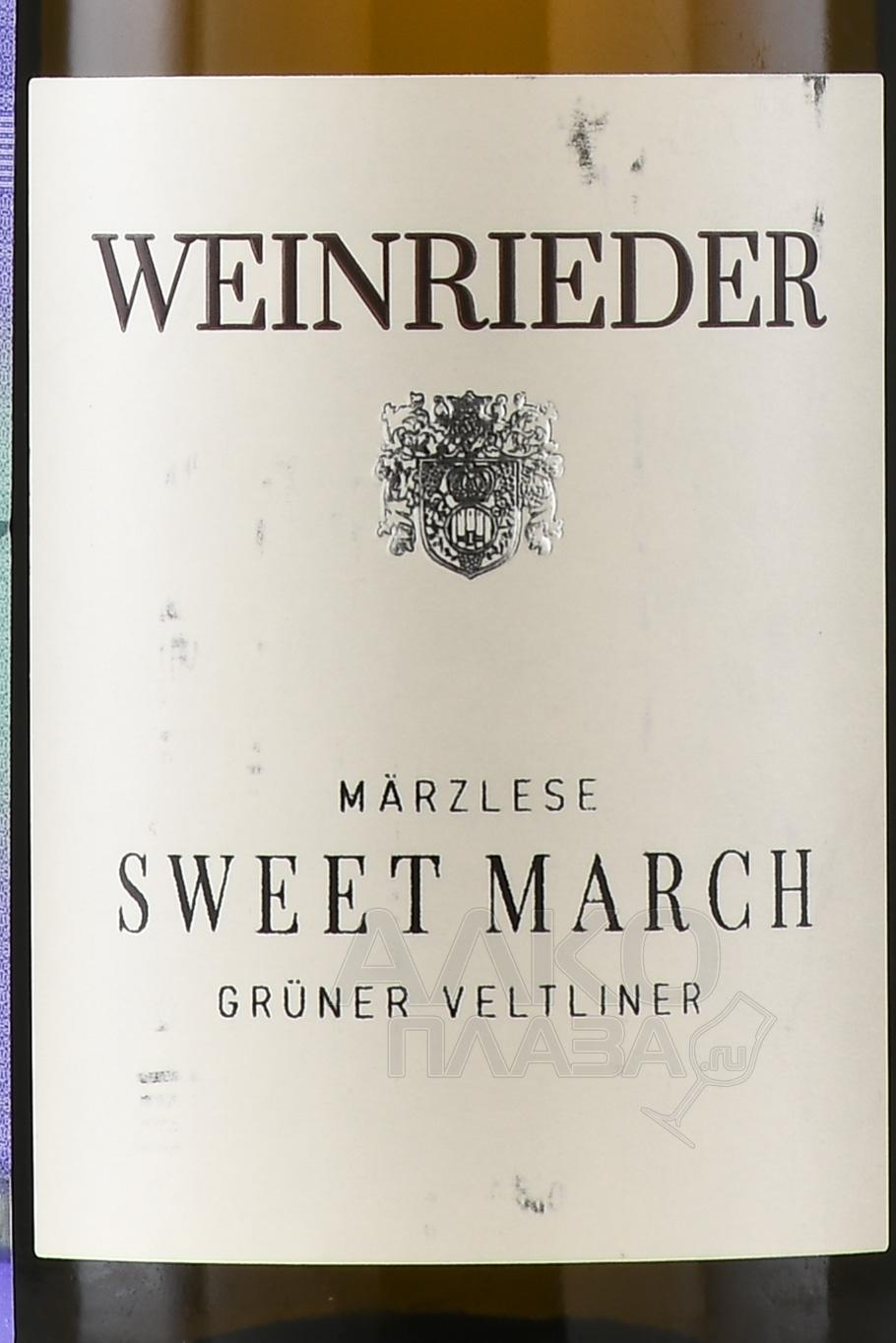 Белое сладкое вино Weinrieder Gruner Veltliner Marzlese Sweet March 0,375 л создано в Австрии из винограда, выращенного в Нижней Австрии, в зоне Вайнфиртель. Участки расположены на северных склонах с почвами из глины, лёсса и гравия, что замедляет созревание и способствует накоплению экстракта. Сырьё отбирают вручную, сбор заканчивается очень поздно, через несколько месяцев после начала. Такое решение позволяет добиться высокой концентрации ароматов и сахаров при сохранённой кислотности. В погребе плоды медленно и мягко прессуют, а сок ферментируют в стальных ёмкостях. Небольшой объём подчёркивает десертный формат и удобен для индивидуальной подачи.