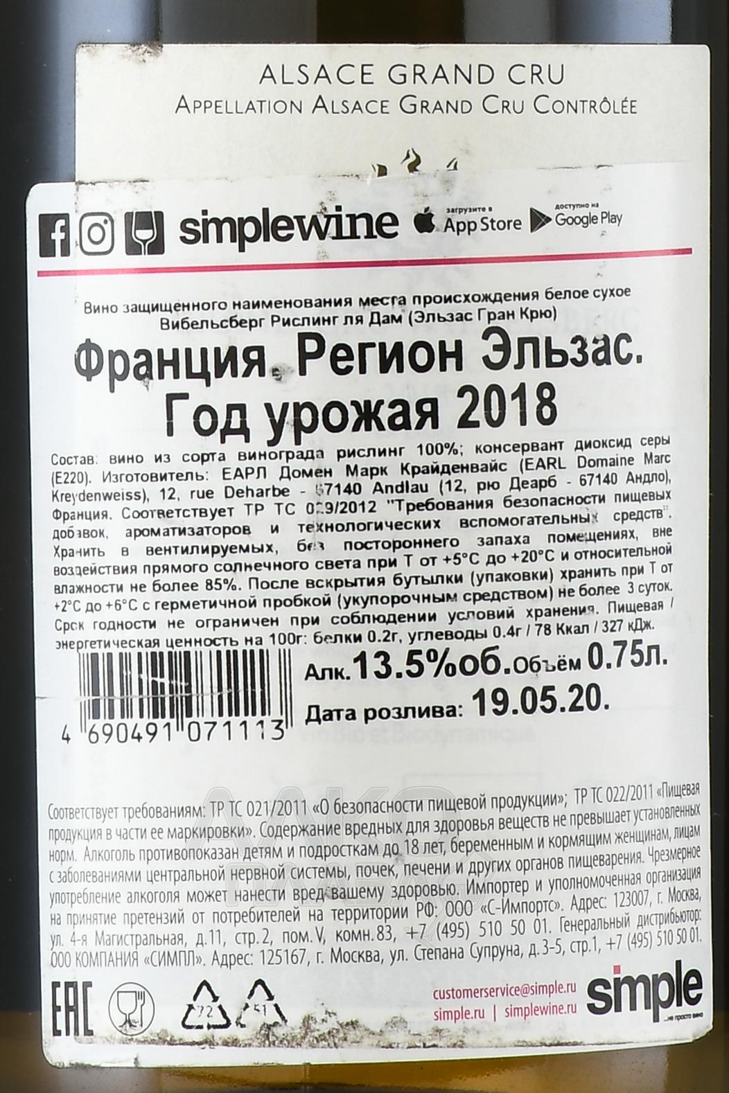 Белое полусухое вино Wiebelsberg Riesling la Dame Alsace Grand Cru 2018 год 0,75 л — высококлассный моносортовой напиток, в котором содержится спелый урожай эльзасского Рислинга. Его собрали на биодинамическом винограднике в определенный год и отсортировали вручную. Ферментация спиртного осуществилась по классической технологии, затем его выдерживали на осадке около одного года. Срок хранения вина оценивается специалистами в двадцать лет.