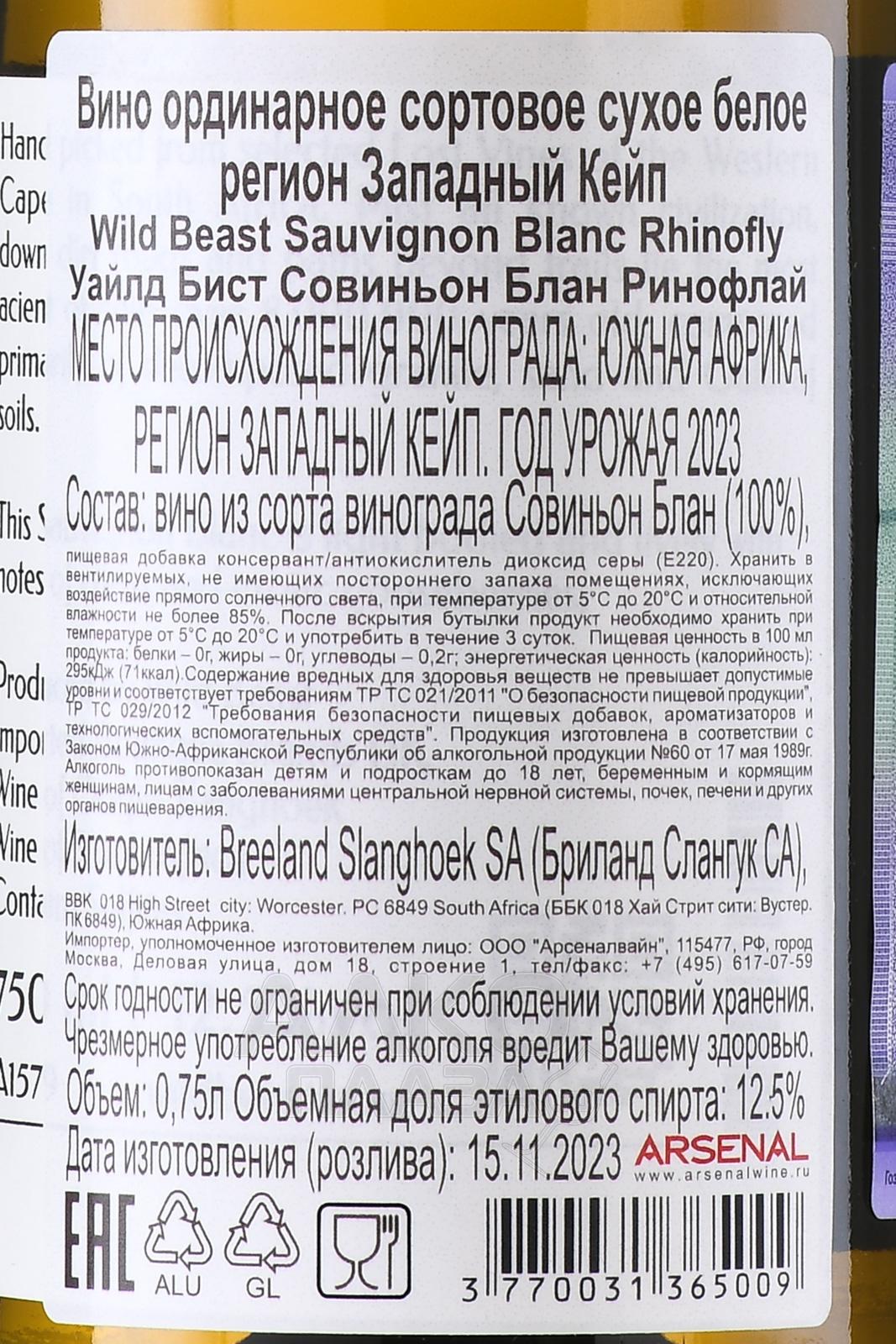 Белое сухое вино Wild Beast Sauvignon Blanc Rhinofly 0,75 л произведено в Южной Африке, в регионе Западный Кейп. Виноград вырастили здесь в прохладном прибрежном терруаре, где господствуют свежие морские ветры. Лозы культивируются на возвышенностях, на песчаных и известковых почвах с хорошей дренажной способностью. Благодаря такому расположению они получают много солнечного света, а прохладные ночи способствуют сохранению нужной кислотности в ягодах. Урожай собрали вручную в ранние утренние часы для сохранения свежести. Винификацию проводили при контролируемой температуре 12–14 °С в ёмкостях из нержавеющей стали. Это помогло сохранить природный аромат и свежесть сорта Совиньон Блан.