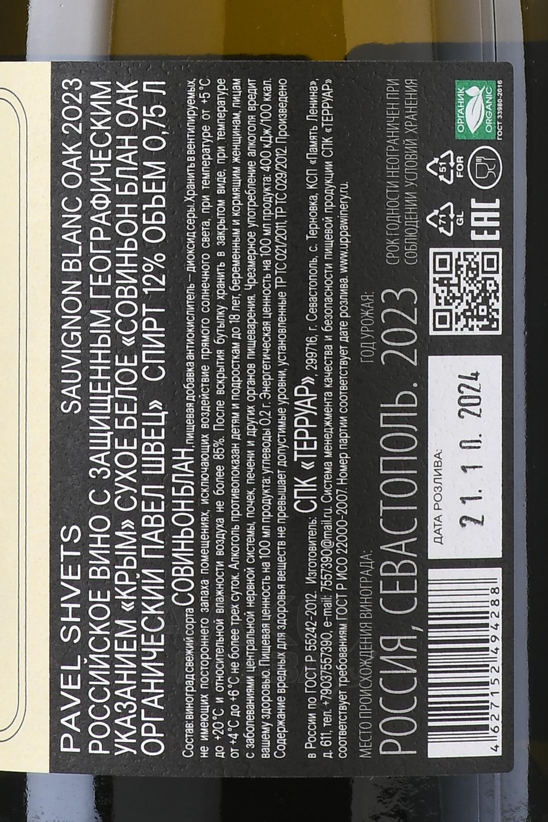 Вино Павел Швец Совиньон Блан Оак Черная Ривер Велли 0,75л белое сухое