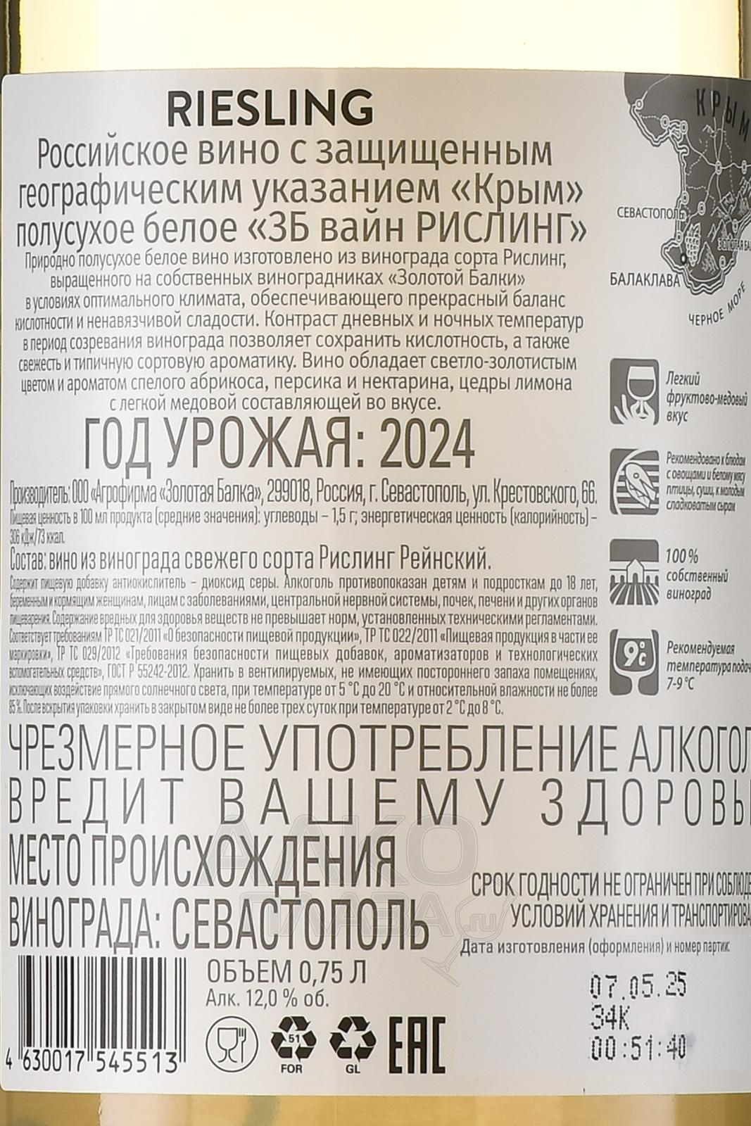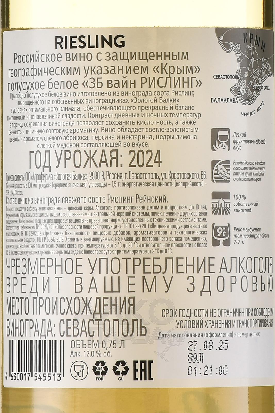Моносортовое вино из международного сорта рислинг. Виноград выращивается на собственных виноградниках. Средний возраст лог 25-30 лет. Почвы богаты песчаником.