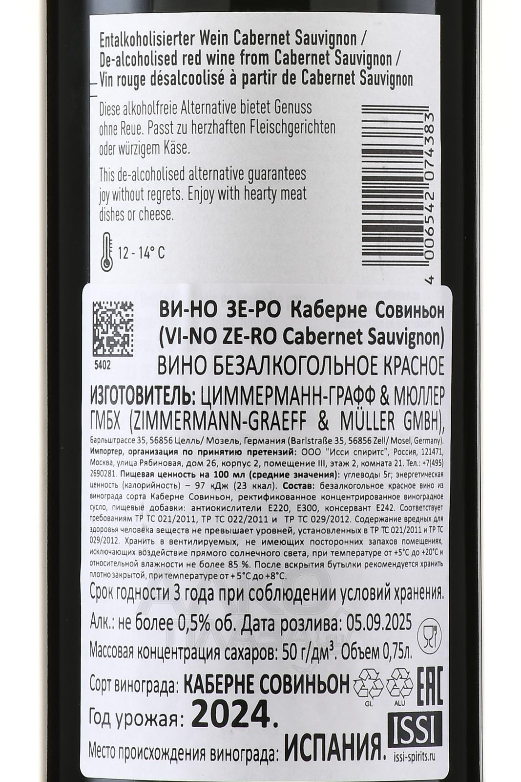 Красное полусладкое безалкогольное вино Vi-no Ze-ro Cabernet Sauvignon 0,75 л производится в Мозеле. Проект разработан как линейка напитков без спирта, ориентированная на сохранение сортового характера исходного сырья. Основой служит виноград, выращенный в традиционных для страны зонах культивирования международных сортов. Сначала получают классическое красное вино, после чего алкоголь удаляется щадящим технологическим методом. Для обогащения вкуса в состав добавляют концентрированное виноградное сусло.