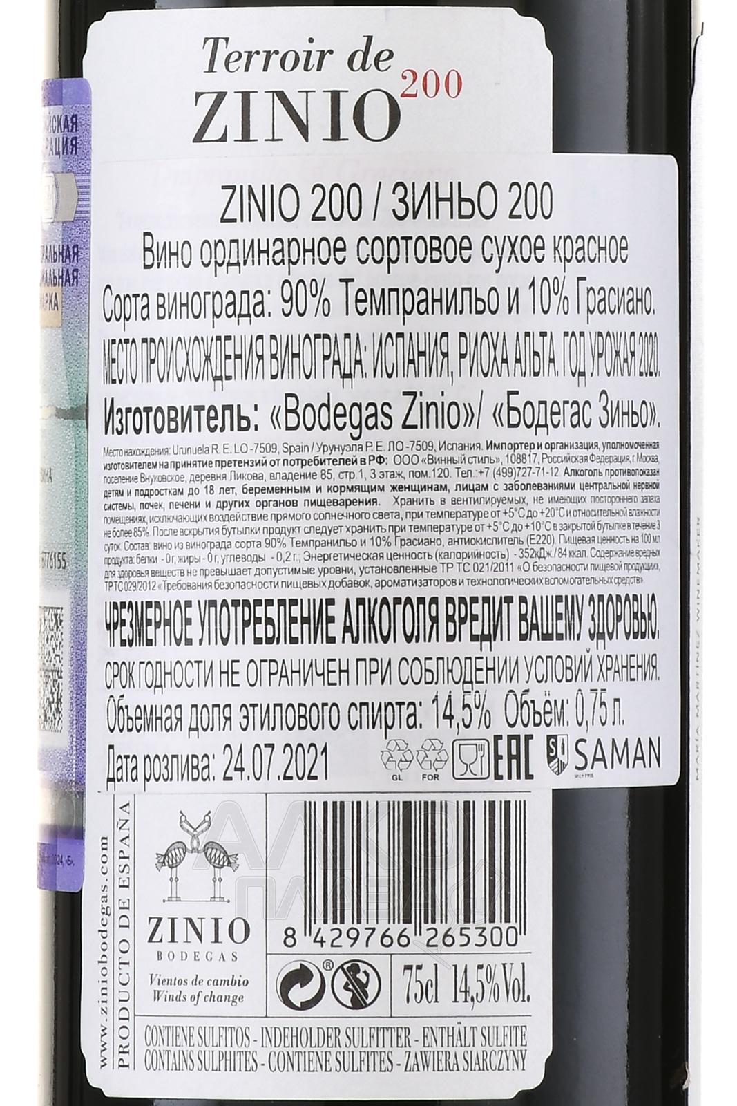 Вино Zinio 200 2020 год 0.75 л было создано из отборных ягод, собранных вручную с лоз, возделываемых на глинисто-известковых почвах региона Риоха. После бережной сортировки и частичной ферментации в стальных чанах с контролем температуры, напиток выдерживался в новых и уже использованных французских и американских дубовых бочках в течение 12 месяцев. Эта технология придала напитку особую глубину и гармоничность вкуса, подчеркнув терруарные характеристики и тонкие оттенки древесины.