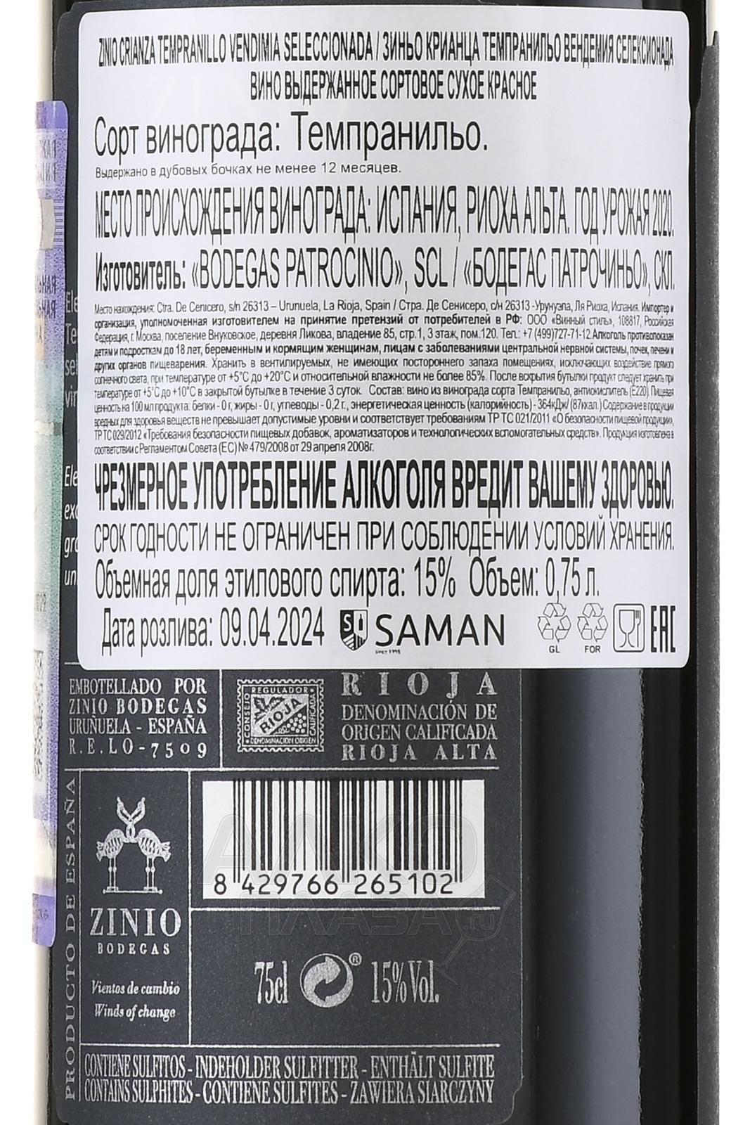 Вино Zinio Crianza Tempranillo Vendimia Seleccionada 2020 год 0.75 л создано из отборных ягод сорта Темпранильо, собранных вручную с лучших виноградников региона Риоха. Урожай проходил строгий контроль качества и был ферментирован при тщательно регулируемых температурах для максимального извлечения ароматических и вкусовых характеристик. В дальнейшем выдержка напитка осуществлялась 14 месяцев в дубовых бочках из французского и американского дуба, придавая конечному продукту элегантность, сложность и утонченную структуру, характерную для вин региона.