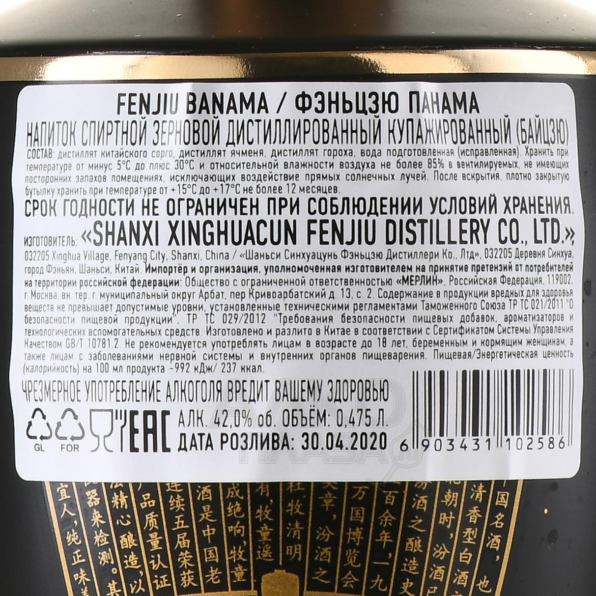 Байцзю Fenjiu Panama 0,475 л в подарочной упаковке – это особый выпуск китайского крепкого напитка. Релиз выпущен в честь награды, полученной брендом на Панамо-Тихоокеанской международной выставке 1915 года. Производится этот образец спиртного в провинции Шаньси из сорго, ячменя и гороха и относится к категории легких ароматов (qingxiang). Процесс получения купажа включает брожение сырья с использованием закваски цюй, перегонку ферментированного сусла, смешивание и долгую выдержку – на протяжении 20 лет. Розлив проходит при крепости 53%.